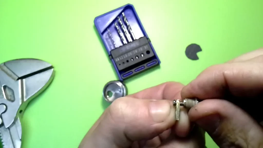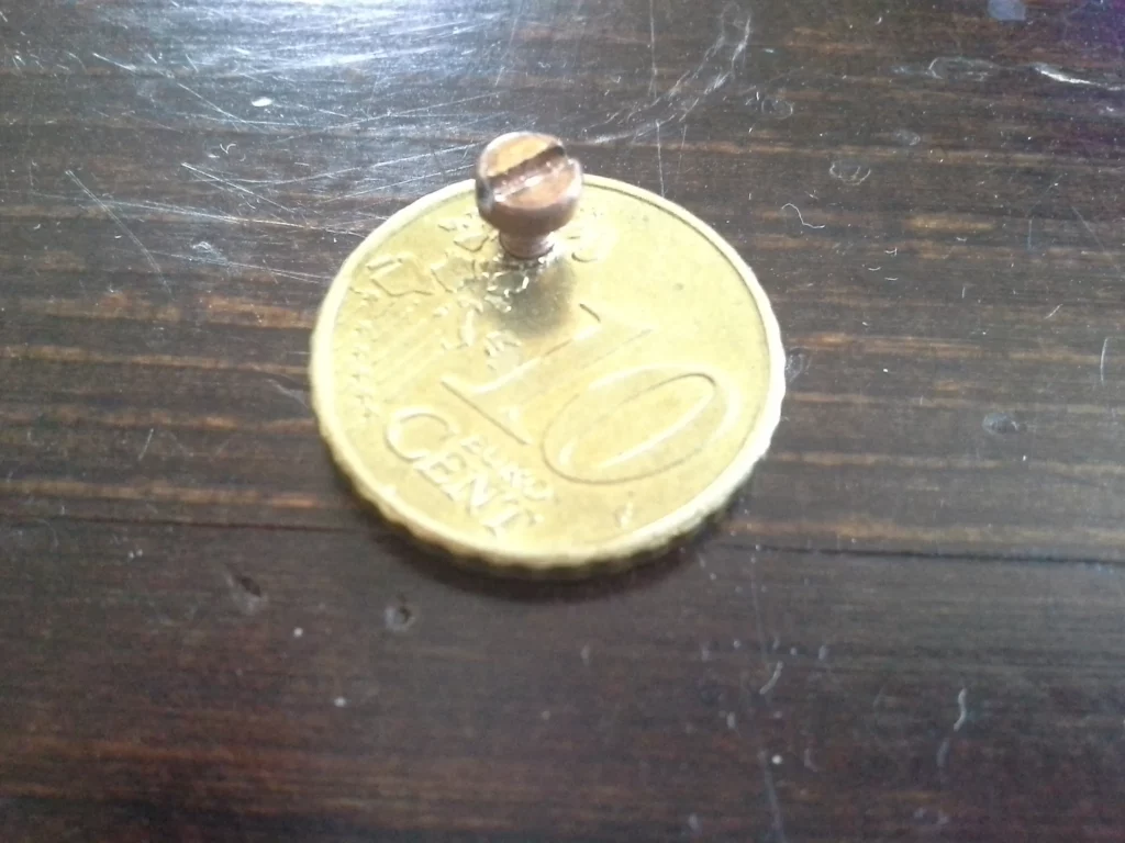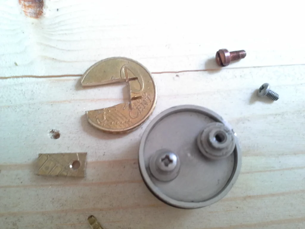 Nun kommt die 10-Cent-Münze ins Spiel. Man schneidet sich mit dem Multitool und einer Trennscheibe ein Stück in den Maßen 6 mm (Breite) und 10 mm (Länge) aus der Münze heraus. Das eine Ende dieser länglichen Brücke wird nun abgerundet (schleifen), damit es nicht an der Seite zu einem Kontakt mit der Hülse des Decks kommt. An dieser Seite wird ein Loch mit 2.5 mm Durchmesser (ohne Gewinde) gebohrt. Dabei sollte man das Loch so ansetzen, dass der Schraubenkopf mit der (abgeschliffenen) Rundung der Brücke ziemlich bündig abschließt.