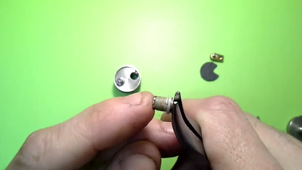 Ist das Kabel erfolgreich angelötet, kann die Base wieder verschraubt werden. Dazu legt man das Kabel schlaufenförmig in die Base (und wenn man mag, verdreht man es leicht entgegen der Drehrichtung für das Zuschrauben). Nun wird das Deck angesetzt und man schraubt es vorsichtig und langsam wieder hinein. Um die Base wieder gegen versehentliches Aufschrauben zu sichern, kommt ein entsprechender Kleber zum Einsatz (Locktite). Es muss aber ein elektrischer Kontakt zwischen Deck und eigentlicher Base vorhanden sein, weshalb man sparsam damit umgehen sollte und man nicht das ganze Gewinde damit einschmieren darf. Es genügt völlig, wenn man das Deck zu einem großen Teil bereits in die Base schraubt und dann in dem noch vorhandenen Spalt etwas von dem Schraubenkleber auf die letzten 1 – 1 1/2 Gewindegänge gibt, bevor man das Deck endgültig bis zum Anschlag einschraubt. Es sollte ordentlich fest, aber nicht bis zum „Kreischen“ festgezogen werden.