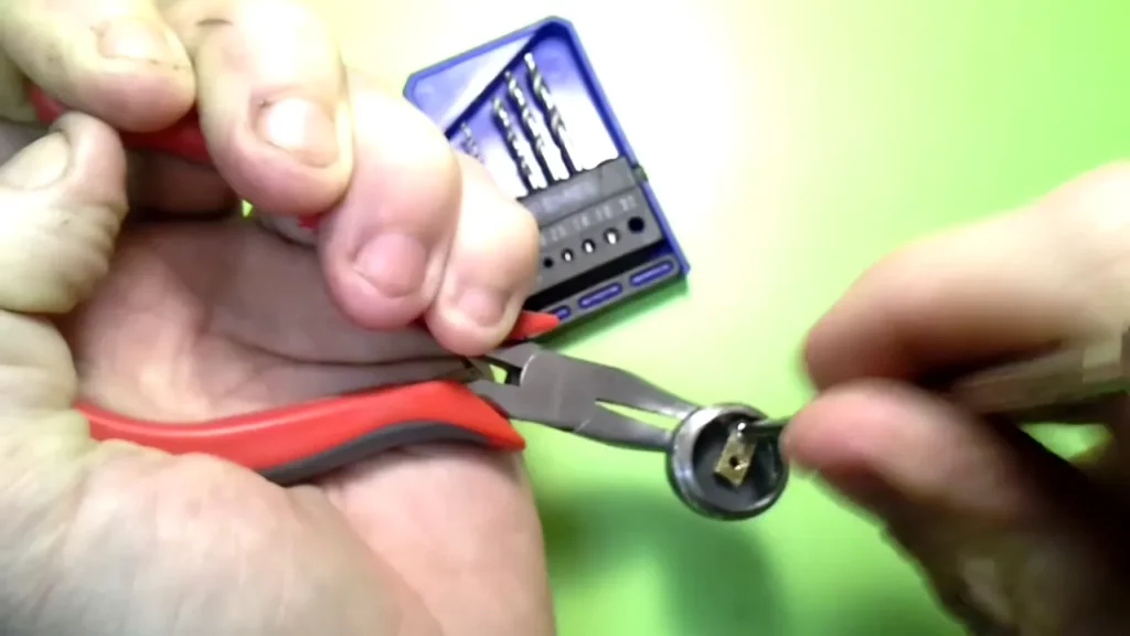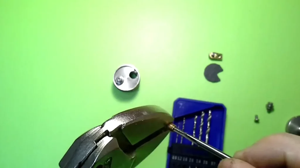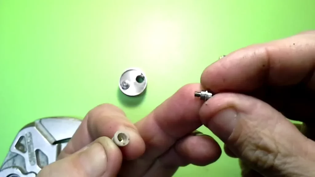 Der Messingpin weist an der Oberseite eine Bohrung mit Innengewinde auf, in die ja der Edelstahlpol hineingeschraubt wird. Die Bohrung ist aber im Originalzustand nicht durchgehend. Das müssen wir ändern. Dazu nimmt man einen möglichst dünnen Metallbohrer (Ron hat einen 0.8er verwendet) und durchbohrt zentral den Pin (selbstverständlich von der bereits vorhandenen Bohrung mit Gewinde aus). Die schon vorhandene Bohrung hat ein 2.5 mm Gewinde. Nun erweitert man die Bohrung genau in der Mitte mit einem 2 mm Metallbohrer. Nun nimmt man den 2.5 mm Gewindeschneider und dreht ihn in das vorhandene Gewinde und schneidet mit Gefühl das Gewinde weiter durch die gesamte Bohrung.