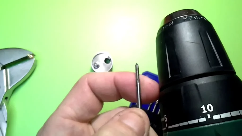 Für den Gewindeschneider verwendet man am besten einen Akkuschrauber mit Drehmomenteinstellung, die man zunächst niedrig einstellt. Die Einstellung kann man dann bei Bedarf verändern, bis man – nochmal: wirklich mit Gefühl – das Gewinde komplett durchgeschnitten hat. Nun hat der Messingpin ein durchgängiges 2.5 mm Innengewinde.