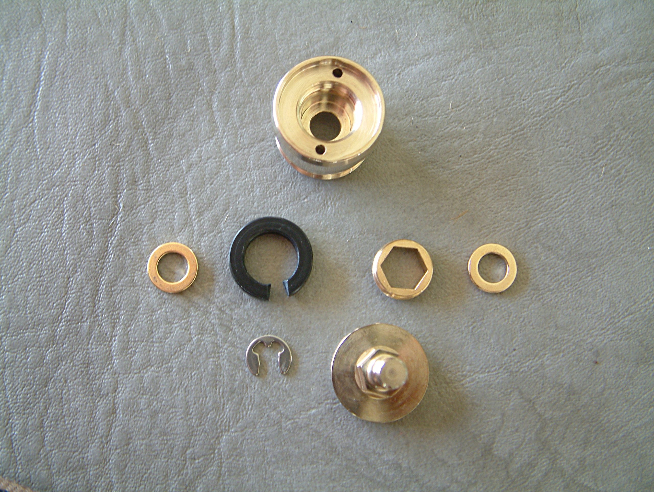 Ich habe schon sehr viele verschiedene mechanische Akkuträger mit den verschiedensten Tastern in den Händen gehabt, aber noch nie einen, der einen so hervorragenden Taster hat, wie der Mk1. Dass auch das Gewinde der Tastereinheit von extrem hoher Qualität ist, habe ich ja bereits erwähnt. Der Taster selbst vermittelt ein nie dagewesenes Druck-Gefühl. Er lässt sich absolut geräuschfrei betätigen und kratzt, schabt oder verkantet nicht. Man hat das Gefühl, er würde sich drücken lassen, ohne dass er den unbeweglichen Teil der Schalter-Einheit berührt. Er kommt ohne Feder aus, sondern funktioniert durch sich gegenseitig abstoßende Ringmagneten im Inneren. Die Tastereinheit ist ebenfalls in Ecobrass ausgeführt. Auf der Seite, die im Akkurohr liegt, ist ein Delrin-Isolatorring angebracht, der sicher stellt, dass auch Akkus ohne Isolierung am Boden nicht zu Dauerfeuer führen. In den Isolatorring ist eine Kerbe eingearbeitet, durch die ein eventueller Überdruck durch einen ausgasenden Akku an die verdeckt und unsichtbar angebrachten Entgasungslöcher entweichen kann und um den in der Schalter-Einheit eingeklemmten Ring leichter entfernen zu können. Der Isolatorring ist an beiden Seiten angefast, an der Innenseite des Schalters stärker, damit die Entgasungslöcher nicht verdeckt werden. Hat man den Isolatorring entfernt, so sieht man die am äußeren Rand gebohrten Entgasungslöcher. Der Pin des Schalter-Pols wird durch einen Sprengring (Wellensicherungsring) gehalten (im Lieferumfang befindet sich ein Ersatz-Ring). Entfernt man diesen (durch Hebeln mit einem Schraubendreher), so kann der Taster nach Unten entnommen werden. Der Taster selbst ist einteilig, besteht aus der eigentlichen Drückerplatte und einer „Achse“, die im unteren Bereich als Sechskant ausgeführt ist und am oberen Ende zum Runden Tasterpol wird. Der als Sechskant ausgeführte Teil dient zwei Zwecken. Einerseits der Führung des beweglichen Schalters und andererseits als „Inbusschlüssel“, mit dem ein in die Bottomcap eingedrehtes Element mit Innensechskant und Außengewinde hinein- und hinausgeschraubt werden kann. Im montierten Zustand lässt sich dieses Teil nicht ganz zwei Gewindegänge herausschrauben. Ist es ausgeschraubt, blockiert es den Taster und dient somit der Locking-Funktion. Das Führungs- und Locking-Element gleitet dabei im Inneren des Schalters in Richtung der Tasterplatte. Das führt dazu, dass sich der Taster auch im gesperrten Zustand nicht herausschraubt… es entsteht kein Spalt, wie bei manch anderen System. Dass auch dieses Gewinde in höchster Qualität ausgeführt ist, brauche ich wohl nicht mehr anzumerken. Gleiches gilt für den Innensechskant und den Sechskantbereich des Tasters. Alles ist derart genau gearbeitet und sauber bearbeitet, dass der Schalter butterweich und ohne zu haken oder zu verkanten bewegt werden kann. Entfernt man im demontierten Zustand den Locking-Part (unter Zuhilfenahme der Taster-Achse), kommen darunter zwei vergoldete Ringmagneten zum Vorschein, die die Feder ersetzen.