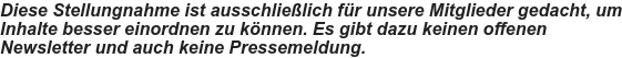 „Diese Stellungnahme ist ausschließlich für unsere Mitglieder gedacht, um Inhalte besser einordnen zu können. Es gibt dazu keinen offenen Newsletter und auch keine Pressemeldung.“