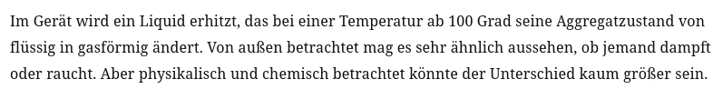 Korrekter wäre die Formulierung: „Im Gerät wird ein Liquid erhitzt, welches dadurch zu einem inhalierbaren Nebel zerstäubt wird.„