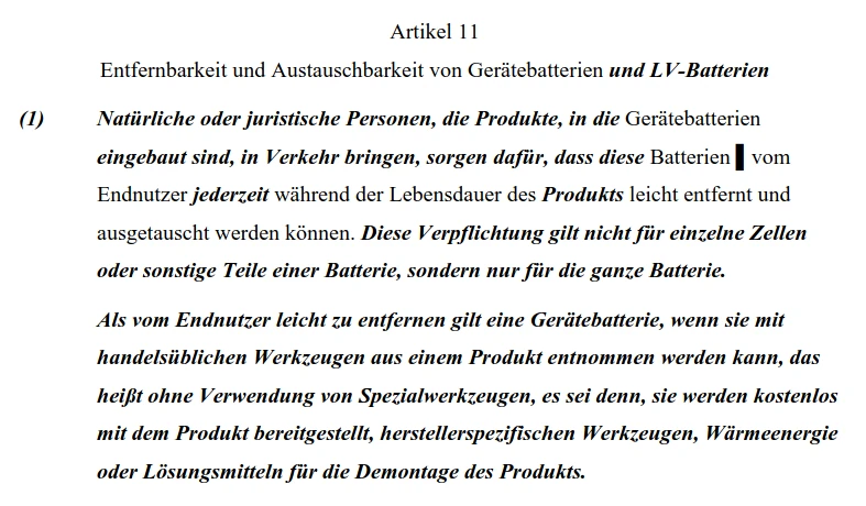 (1) Natürliche oder juristische Personen, die Produkte, in die Gerätebatterien eingebaut sind, in Verkehr bringen, sorgen dafür, dass diese Batterien vom Endnutzer jederzeit während der Lebensdauer des Produkts leicht entfernt und ausgetauscht werden können. Diese Verpflichtung gilt nicht für einzelne Zellen oder sonstige Teile einer Batterie, sondern nur für die ganze Batterie.