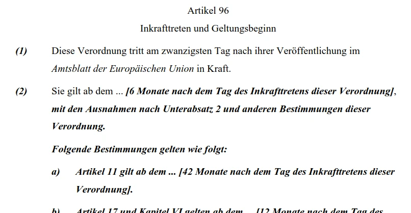 Wir haben jetzt den 18. Juni 2023. Die EU-Verordnung ist vom Parlament beschlossen worden. Nun muss sie noch vom Rat abgenickt werden (wann auch immer das auf der Tagesordnung steht). Dann ist sie endgültig durch und wird im Amtsblatt der EU veröffentlicht. Und ab diesem Zeitpunkt beginnen die Fristen zu laufen.