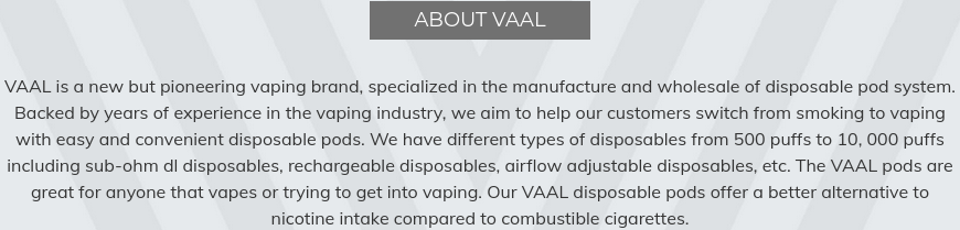 VAAL ist eine neue, aber wegweisende Vaping-Marke, die sich auf die Herstellung und den Großhandel mit Einweg-Pod-Systemen spezialisiert hat. Basierend auf jahrelanger Erfahrung in der Vaping-Branche möchten wir unseren Kunden helfen, mit einfachen und bequemen Einweg-Pods vom Rauchen zum Vaping zu wechseln. Wir haben verschiedene Arten von Einwegartikeln von 500 Zügen bis 10.000 Zügen, einschließlich Sub-Ohm-DL-Einwegartikeln, wiederaufladbaren Einwegartikeln, Einwegartikeln mit einstellbarem Luftstrom usw. Die VAAL-Pods sind großartig für alle, die dampfen oder versuchen, mit dem Dampfen anzufangen. Unsere VAAL-Einwegkapseln bieten im Vergleich zu brennbaren Zigaretten eine bessere Alternative zur Nikotinaufnahme.