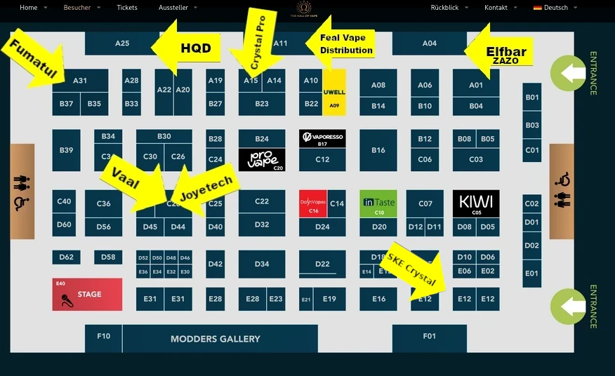 Weitere große Stände von Großhändlern werden u.a. Feal Vape Distribution mit dem Stand A11 und HQD Europe mit dem Stand A25 sein.