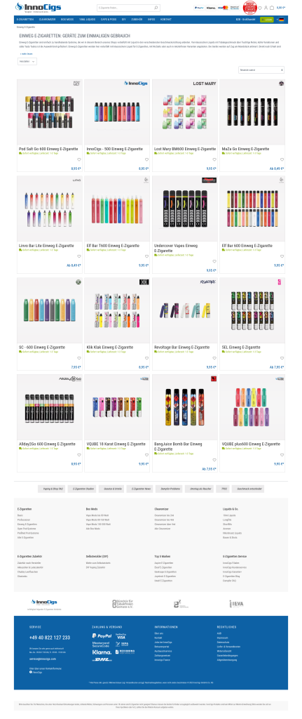 Innocigs führt auch die Sortimentstiefe bei Einweg E-Zigaretten an. Inzwischen sind es noch 16 verschiedene Einweg E-Zigarettenmarken. Darunter zu finden: der Marktführer Elfbar, die auch zu dem Unternehmen gehörende Lost Mary, die Rapper Marke von 18 Karat und die Rapper Marke Undercover von Samra sowie die Eigenmarken SC und Innocigs.