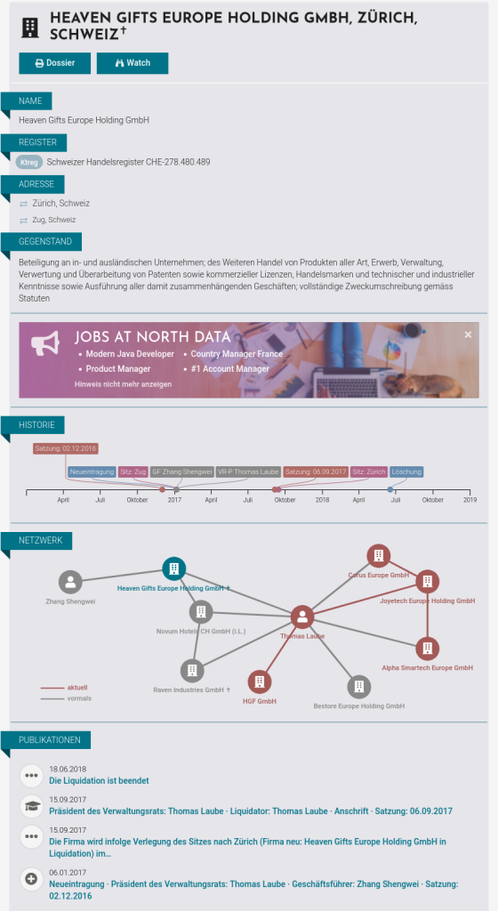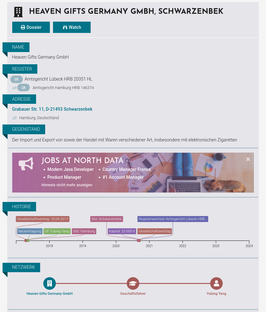 Die Schweizer Holding z.B. unter dem Namen Heavengifts Europe Holding GmbH, seinerzeit von Shengwai Zhang und Thomas Lauber, der vorher in für die Joyetech Europe Holding GmbH seine Dienste bereitstellte, wurde bereits 2018 liquidiert.