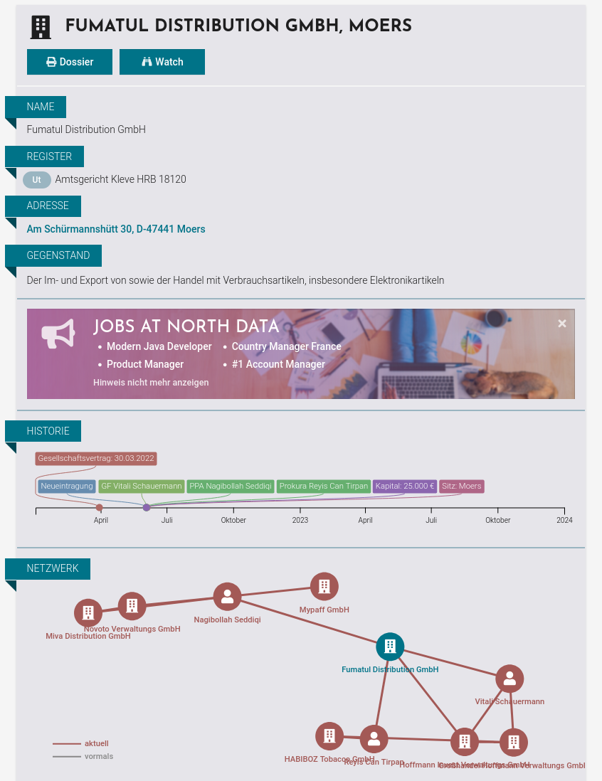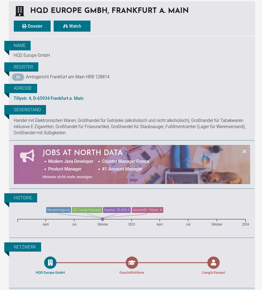 HQD Europe ist ein Großhändler unter der Firmierung CIRAK Electronics GmbH mit Sitz in Frankfurt am Main/ Hessen. Sieht man sich auf google maps die Tillystraße 4 mal genauer an, sieht man ein Kiosk btw Tabakwarenhandel mit weiteren Artikeln wie z.B. Eis, Süßwaren, Einweg E-Zigaretten und Getränken. Das ist dann sozusagen das offline Geschäft des Großhandels mit sehr wahrscheinlich trotz Einweg Hype weiterhin einem Hauptumsatz, der über Tabak und Tabakzigaretten abgebildet wird. Die Online Präsenz hat allerdings den Sitz Sulzbach im Main Taunus Kreis hinterlegt.