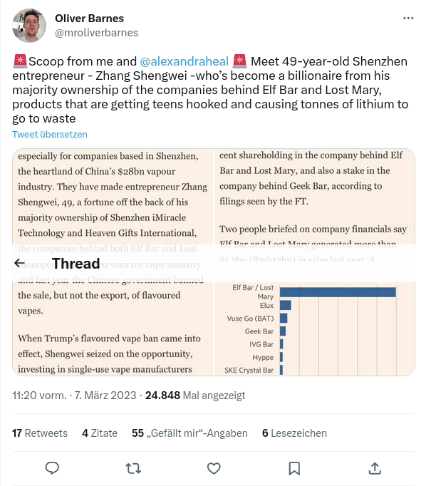 Mit der hochgelobten „Fachberatung“ eines Fachhändlers hat das gar nichts zu tun. Eher im Gegenteil: Kasse mit Unerfahrenen machen und die alten Dampfer potenziell auch vom Weg abzubringen und von der bunten, überzuckerten und überdosierten Froststange abhängig zu machen, die laut eines Abfüllers hinter vorgehaltener Hand „in dieser Geschmacksintensivität nicht durch die Analytik zu kriegen sind“. Na dann, herzlichen Glückwunsch zur Harm Reduction, Dustin Dahlmann.