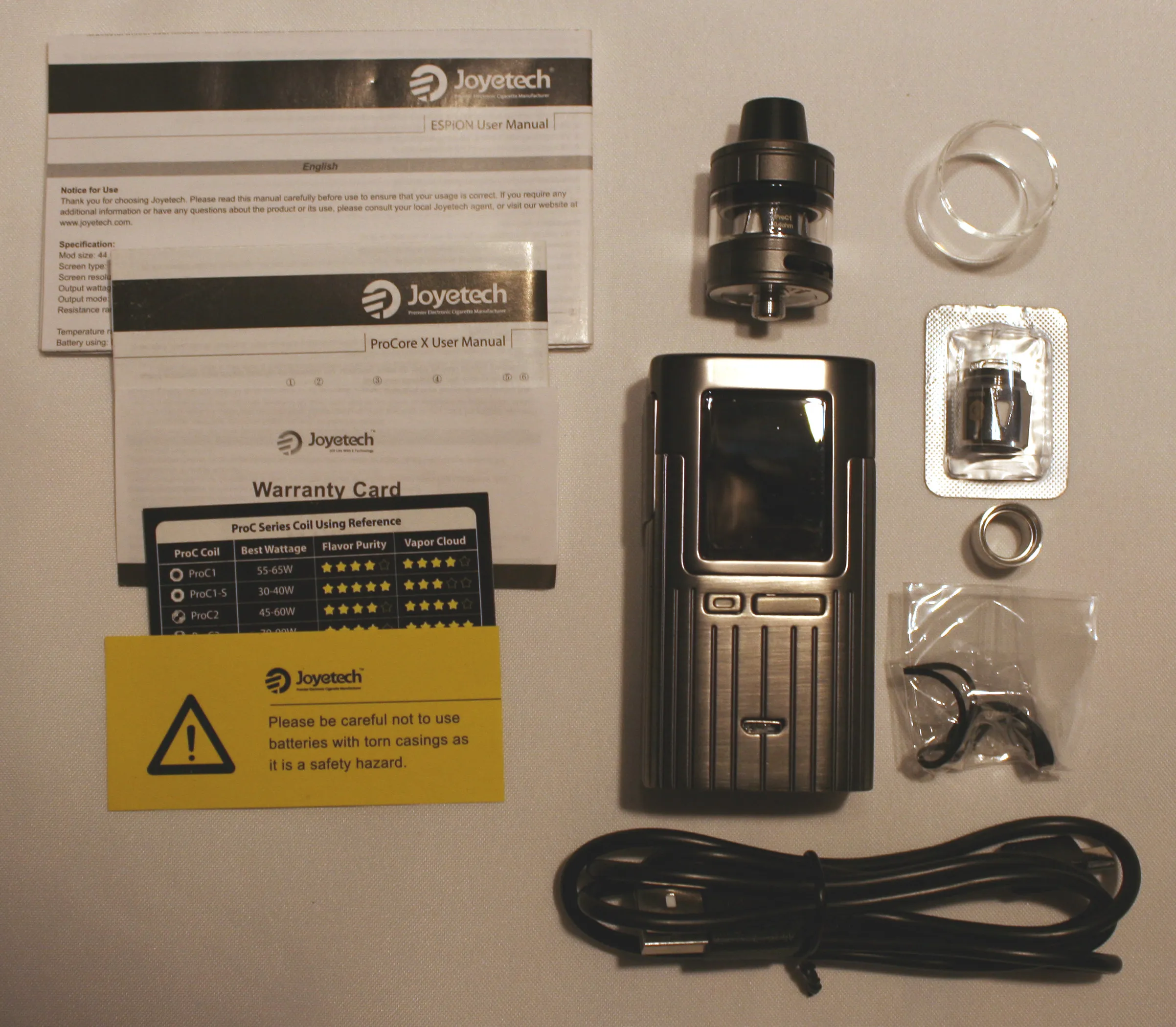 Die dritte Kombi im Bunde ist das Set Joyetech Espion mit ProCore X, das sich schon eher an den fortgeschrittenen Dampfer richtet, obwohl auch Einsteiger damit etwas anfangen können. Es ist ein ausgesprochen „erwachsenes“ und ausgereiftes Set.