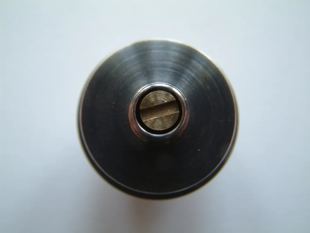 Zunächst mal die nackten Zahlen und Fakten! Die Eviva ist ein recht kompakter Verdampfer mit einem Durchmesser von 23 mm. Damit passt sie wie angegossen z. B. Auf einen Chi You, den sie bei mir schmückte. Auf den Atermon passt sie natürlich noch besser, so man die 23mm-Version sein Eigen nennt. Die Höhe ohne Drip Tip und 510er Anschluss beträgt 36,5 mm (gemessen knapp 37 mm). Sie besteht aus lebensmittelzugelassenem AISI 304L Edelstahl. Der flächige Isolator in der Base ist aus PEEK (Ketron®), einem sehr hitzebeständigen Kunststoff. Zur Fixierung der Wicklung, bzw. zur Lenkung des Zuluft-Stroms, dient entweder die klassische CE2 Keramik, oder ein kleiner Zylinder aus Edelstahl (ES-Housing; die Wicklung wird dann schwebend darüber angebracht und er dient nur dazu, die Zuluft zu kanalisieren). Diese werden in die Base gesteckt und von zwei kleinen O-Ringen gehalten. Der Einsatz der Keramik legt zunächst die Vermutung nahe, man müsse die Eviva mit Kombidrähten betreiben. Dem ist aber nicht so. Die Befestigung des Heizdrahtes erfolgt über zwei Terminals in der Base, die mit Inbus-Schrauben versehen sind.