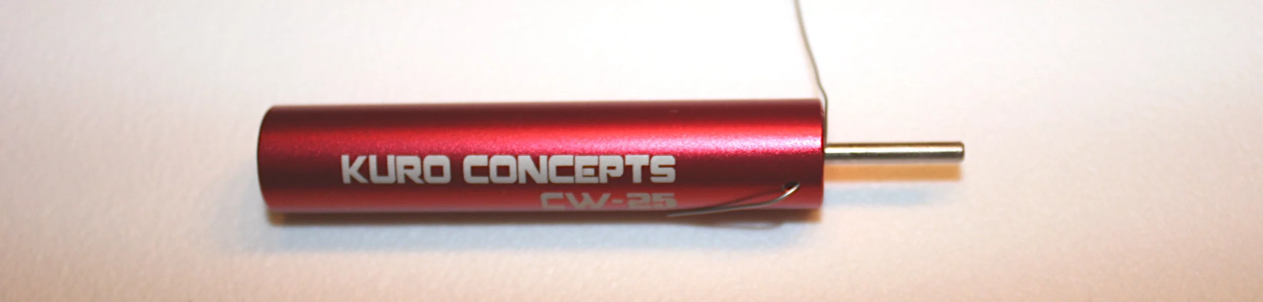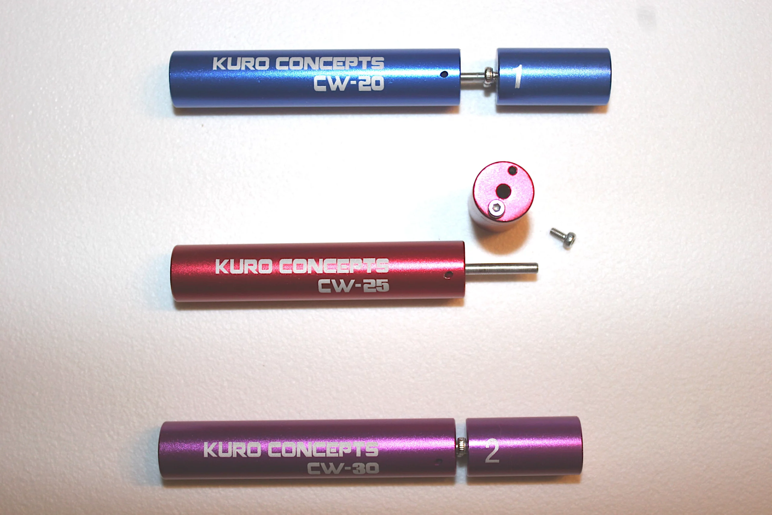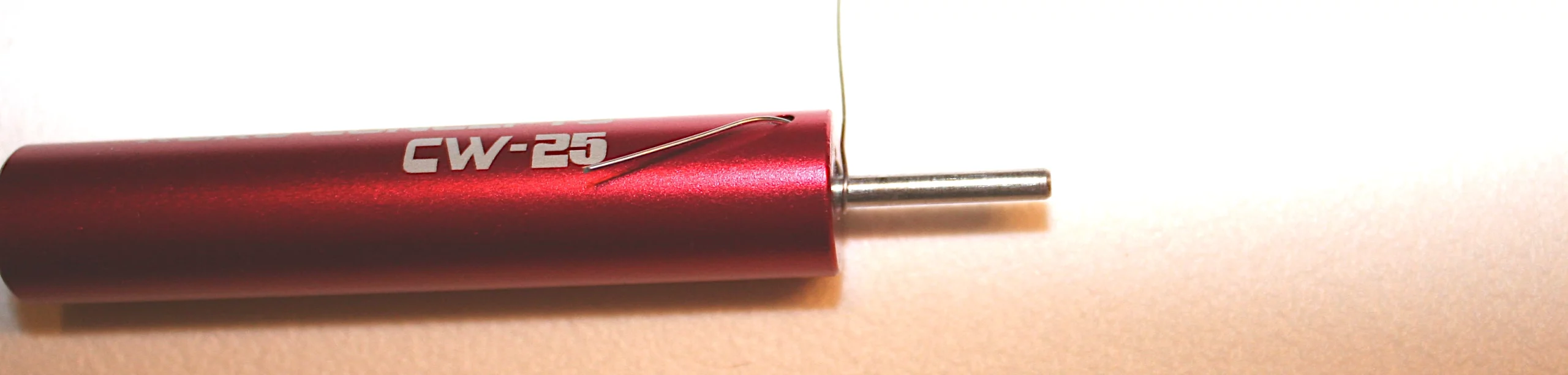 Die Tools bestehen aus einer zylindrischen Basis, an deren Stirnseite eine Wickelhilfe aus Metall eingesetzt ist. Diese kann man entnehmen, sie wird mittels einer kleinen Inbus-Madenschraube fixiert (einige Modelle eines bekannten chinopsischen Versandhandels sind so ausgeführt, dass sie fest mit der Basis verbunden sind… geht aber auch). Der Aufdruck auf der Basis gibt Auskunft über den Durchmesser der Wickelhilfe und über den damit herzustellenden Wicklungsdurchmesser. CW-20 steht für 2.0 mm, CW-25 für 2.5 mm, CW-30 für 3.0 mm. Der Original-Hersteller bietet auch Sets mit weiteren Durchmessern an, aber mit diesem Dreier-Set ist man für die meisten Fälle recht gut gerüstet. Gegenüber der Bohrung für die Madenschraube zur Fixierung der Wickelhilfe ist eine schräge Bohrung angebracht, durch welche man den Wickeldraht führt, so dass er direkt neben der Wickelhilfe an der Stirnseite der Basis wieder heraus kommt.