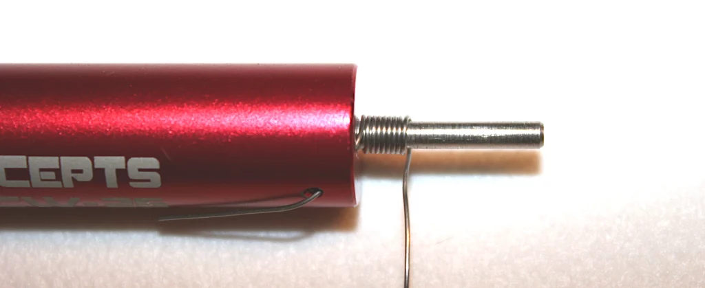 Nun aber zum Wickeln! Wie bereits erwähnt schiebt man den Draht durch die schräge Bohrung in der Basis und lässt ein kurzes Stück seitlich an der Basis herausstehen, welches man mit einem Finger der haltenden Hand fixiert. Anschließend führt man die erste (bzw. erste dreiviertel) Wicklung normal von Hand aus. Dann setzt man die Kappe mit der passenden Schraube auf, so dass diese hinter dem Drahtende aufliegt. Nun dreht man mit leichtem Gegendruck die Kappe auf der Achse, so dass sich der Draht nach und nach um die Wickelhilfe legt. Jede Umdrehung bringt – logisch – eine weitere Wicklung auf die Wickelhilfe. Bei stärkeren Drähten sollte man eine halbe Umdrehung mehr machen, da die Federkraft des Drahtes diesen nach Abnehmen der Kappe ein Stückchen zurück federn lässt.