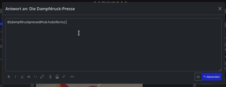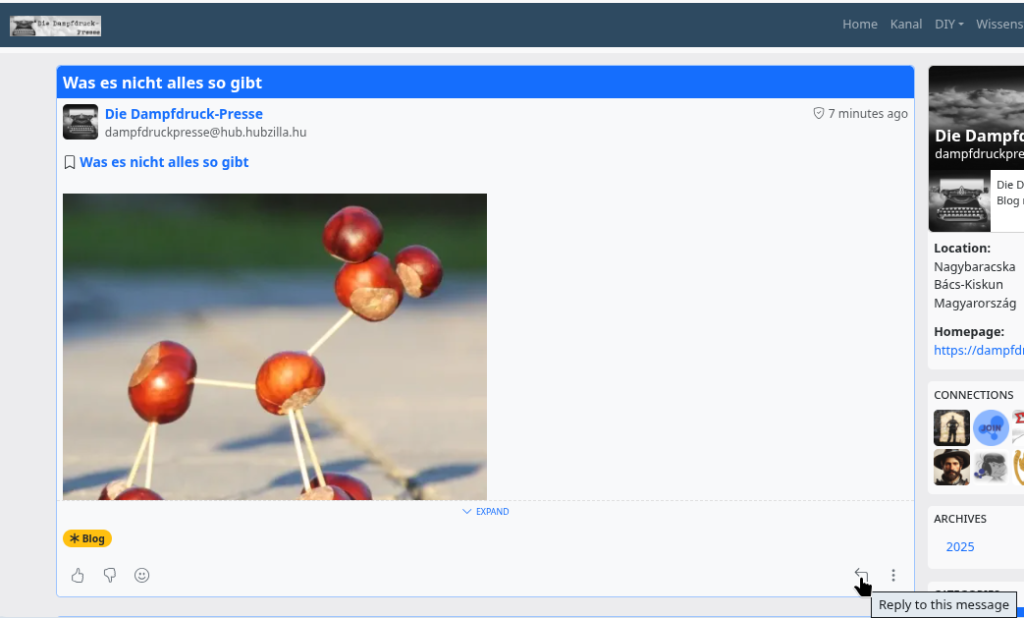 Die meisten werden wohl schon von Mastodon gehört haben…oder womöglich sogar selbst einen Account bei einer Mastodon-Instanz haben. Und wer dann die DDP verfolgen möchte, „folgt“ dann einfach der DDP im Fediverse (@dampfdruckpresse@hub.hubzilla.hu). Sobald ich einen neuen Artikel veröffentliche, landet der dann auch in der Timeline des Nutzers. Und er kann bei Mastodon dann ganz einfach antworten, wie er es auch mit anderen Postings tut.