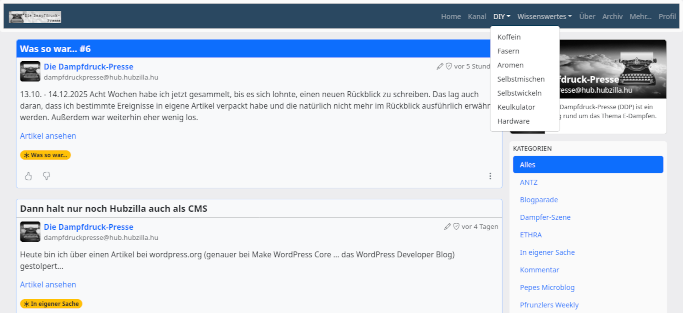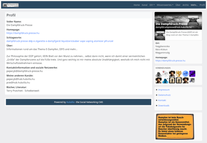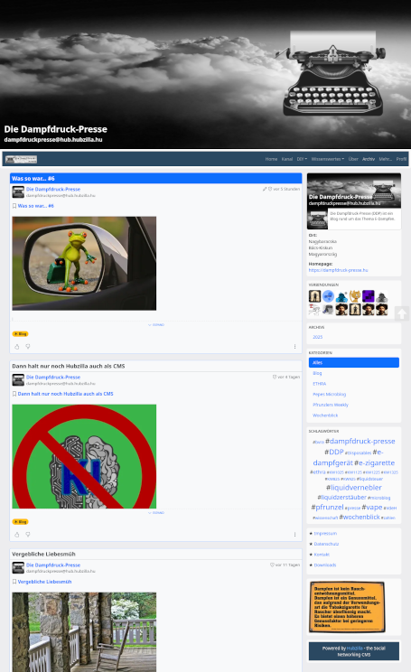 Neu hinzugekommen ist die Kanalseite. Hier wird der aktuelle Fediverse-Stream der Dampfdruck-Presse angezeigt, wo ich auch immer auf neue Artikel verweise, sobald ich sie veröffentlicht habe. Diesem Stream kann man auch mit einem RSS-Reader folgen und man wird immer aktuell informiert, sobald sich in der DDP etwas tut.