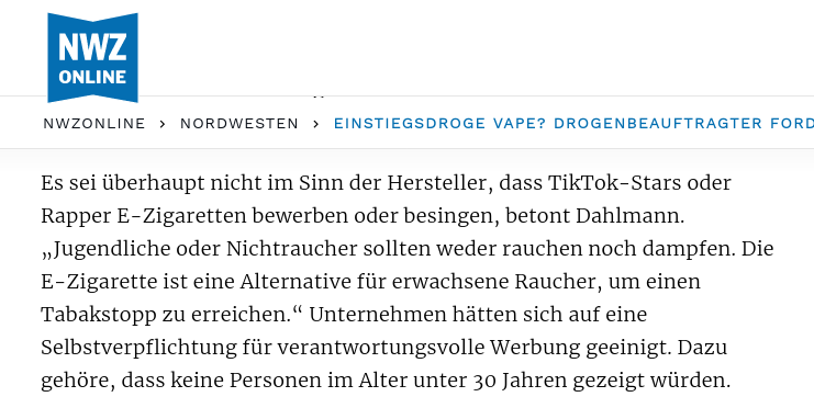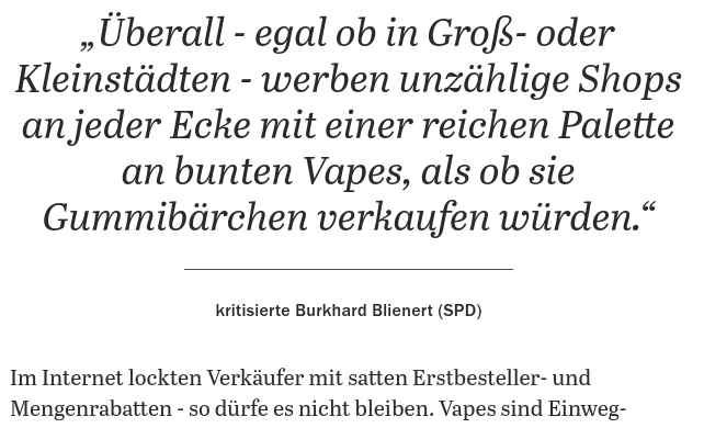 In der Zwischenzeit bringt der Bundesdrogenbeauftragte Burkhard Blienert das böse A….-Wort ins Spiel. Der Einweg Schrott hat das voll Karacho beschleunigt. Vor dem drohenden Aromenverbot warnte Patrick Fleischer (Geschäftsführung Pipeline), aber auch ausreichend Dampfer aus der Blase schon vor anderthalb Jahren, als die Importeure meinten fleißig Einweg Schrott zu importieren. Jetzt brennt das Dach und die Leitungen und das Postfach bei Burkhard Blienert und wie lässt Dustin Dahlmann seine Antwort auf den Flächenbrand in der Presse zitieren?