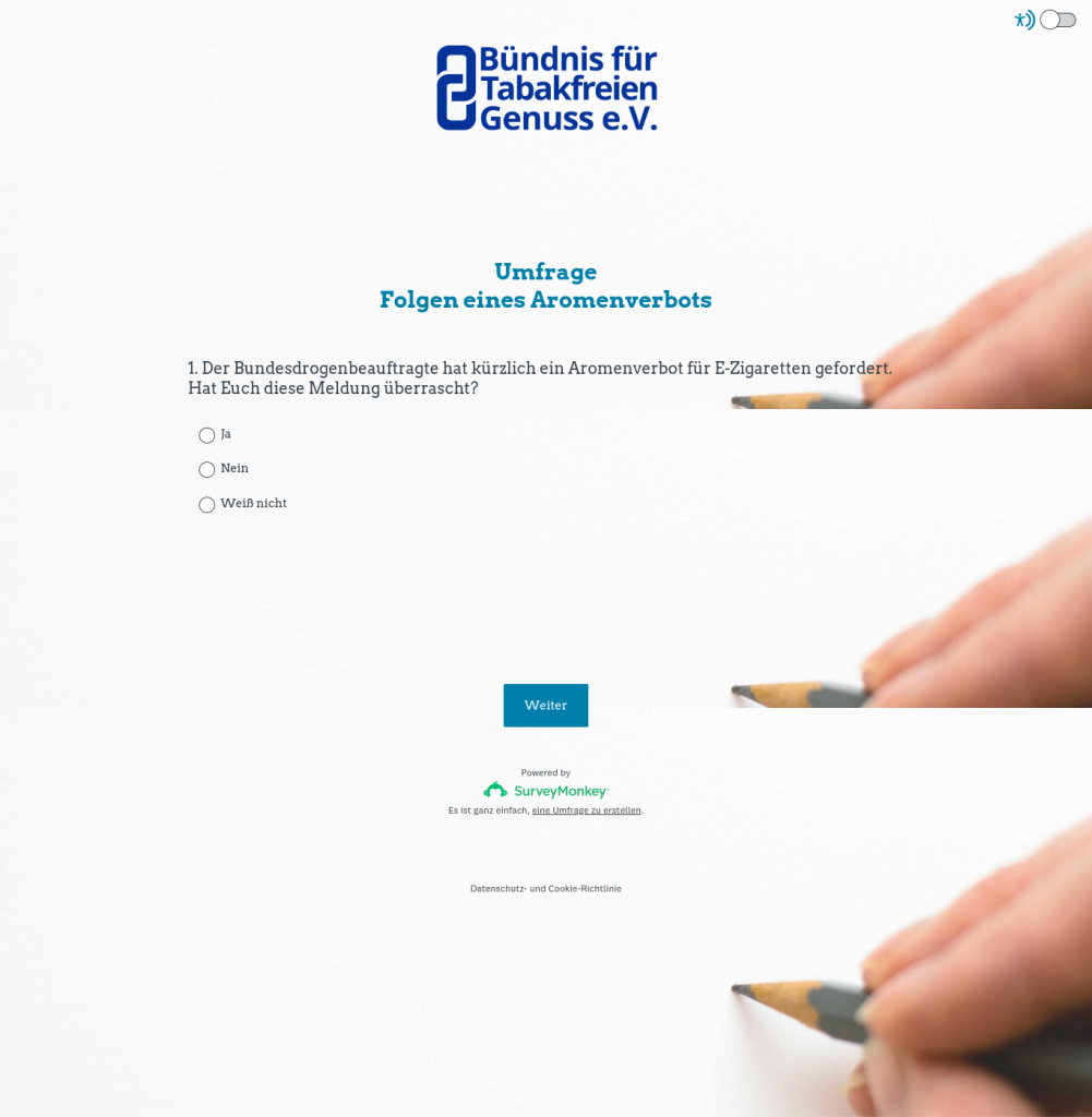 Jetzt brennt der Baum ordentlich und das BfTG startet fix mal wieder eine Umfrage auf facebook an der Händler, aber auch sonst jeder beliebig oft teilnehmen kann. Eingeleitet wird die Umfrage mit einer selten dämlichen Frage. Es wird gefragt, ob die befragten Händler überrascht von dem Aromenverbot Vorstoß des Bundesdrogenbeauftragten sind?