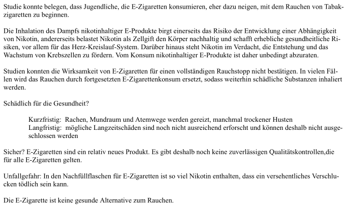 Da kommt also z.B. ein Neueinsteiger daher, schaut sich im Internet um, landet auf der Seite des Dampfer-Magazins. Dann findet er den Beitrag, der ihm weitere Informationen verspricht und er landet auf der Seite des BZgA. Da gibt er „E-Zigarette“ ein und bekommt solche „Informationen“ serviert: