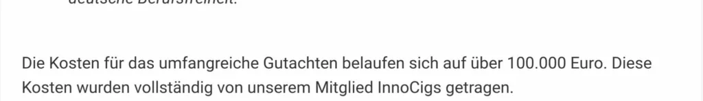 „Die Kosten für das umfangreiche Gutachten belaufen sich auf über 100.000 Euro. Diese Kosten wurden vollständig von unserem Mitglied InnoCigs getragen.“