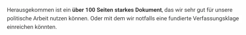 „Herausgekommen ist ein über 100 Seiten starkes Dokument, das wir sehr gut für unsere politische Arbeit nutzen können. Oder mit dem wir notfalls eine fundierte Verfassungsklage einreichen könnten.“