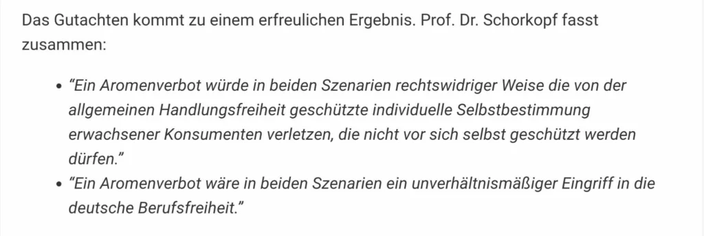 Niemand gibt so eine Rechtsmeinung in Form eines Rechtsgutachten in Auftrag, wenn er davon überzeugt ist, das Aromenverbot sei abgewendet.