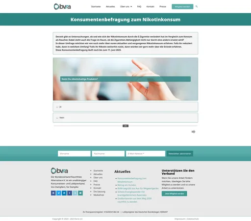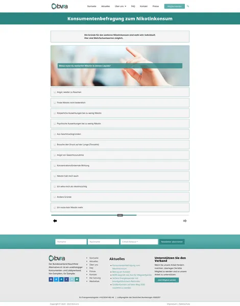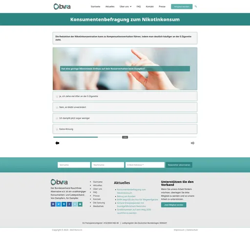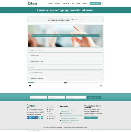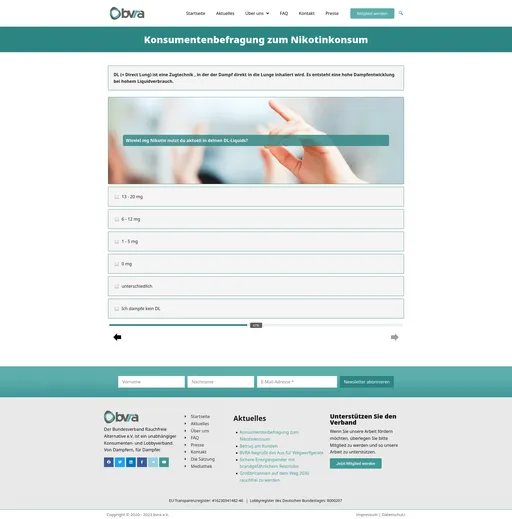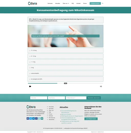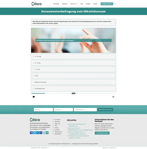 Die ersten drei Fragen sind recht unverfänglich und die dritte (nach der Nikotinstärke des Liquids beim Einstieg) sogar ganz interessant. Das kann Argumente gegen eine – der Flurfunk hat was aufgeschnappt – kommende weitergehende Beschränkung der maximalen Niktinstärke liefern.