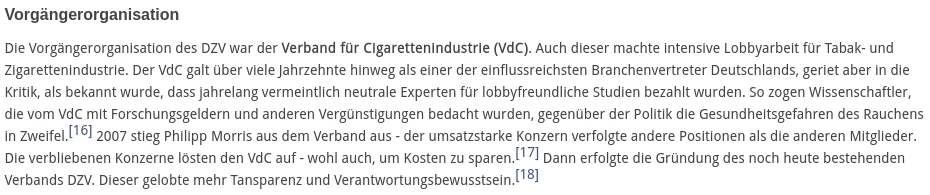 Der VDC genoss keinen wirklich guten Ruf. Insbesondere wurde ihm vorgeworfen lange Zeit Studien zu den Gefahren des Rauchens unterdrückt und einen enormen Einfluss auf die Politik genommen zu haben. Der VDC war jener Verband, der den Bundesministerien teilweise Gesetzentwürfe rund um den Tabak fix und fertig geschrieben hat (teilweise gab es Gesetzentwürfe, die identisch mit den Formulierungen des VDC waren…inklusive der Rechtschreibfehler).