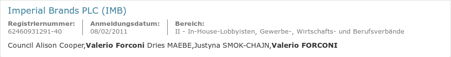 Und er ist auch nicht als „Person“ im Transparenzregister der EU eingetragen, sondern taucht als Mitarbeiter von „Imperial Brands PLC“ (die sind da als Lobby eingetragen) auf. (Meinen Namen findet man da übrigens auch… 😉 )