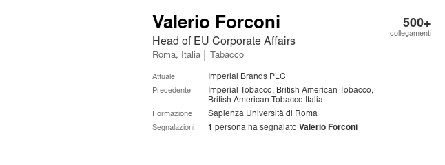 Die Rede ist hier von Valerio Forconi. Und der ist „Head of EU Corporate Affairs“ bei Imperial Brands und nicht irgendwer, der auch mal mit Imperial Brands zusammenarbeitet.