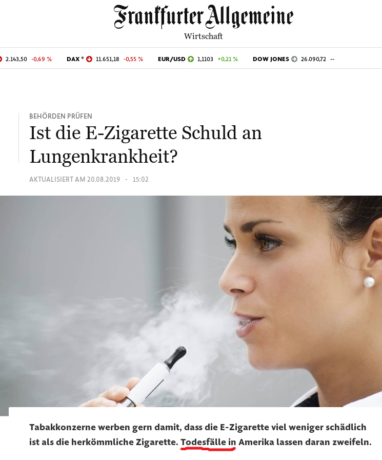 Den absoluten Vogel hat heute die Frankfurter Allgemeine Zeitung (FAZ) online abgeschossen, als sie nun auch noch Todesfälle dazugelogen hat (zu einem Zeitpunkt, als die Ursache schon bekannt geworden war und hochoffiziell in den USA mitgeteilt). Ja, im Ernst… bei denen gab es jetzt schon „Dampfer-Tote“… die haben wohl nicht mitbekommen, dass etliche der Betroffenen schon wieder aus dem Krankenhaus raus sind (nicht liegend in der Holzkiste, sondern aufrecht). Aber nein, sie nehmen die Wirkung der falschen Horrormeldung noch schön mit und schreiben