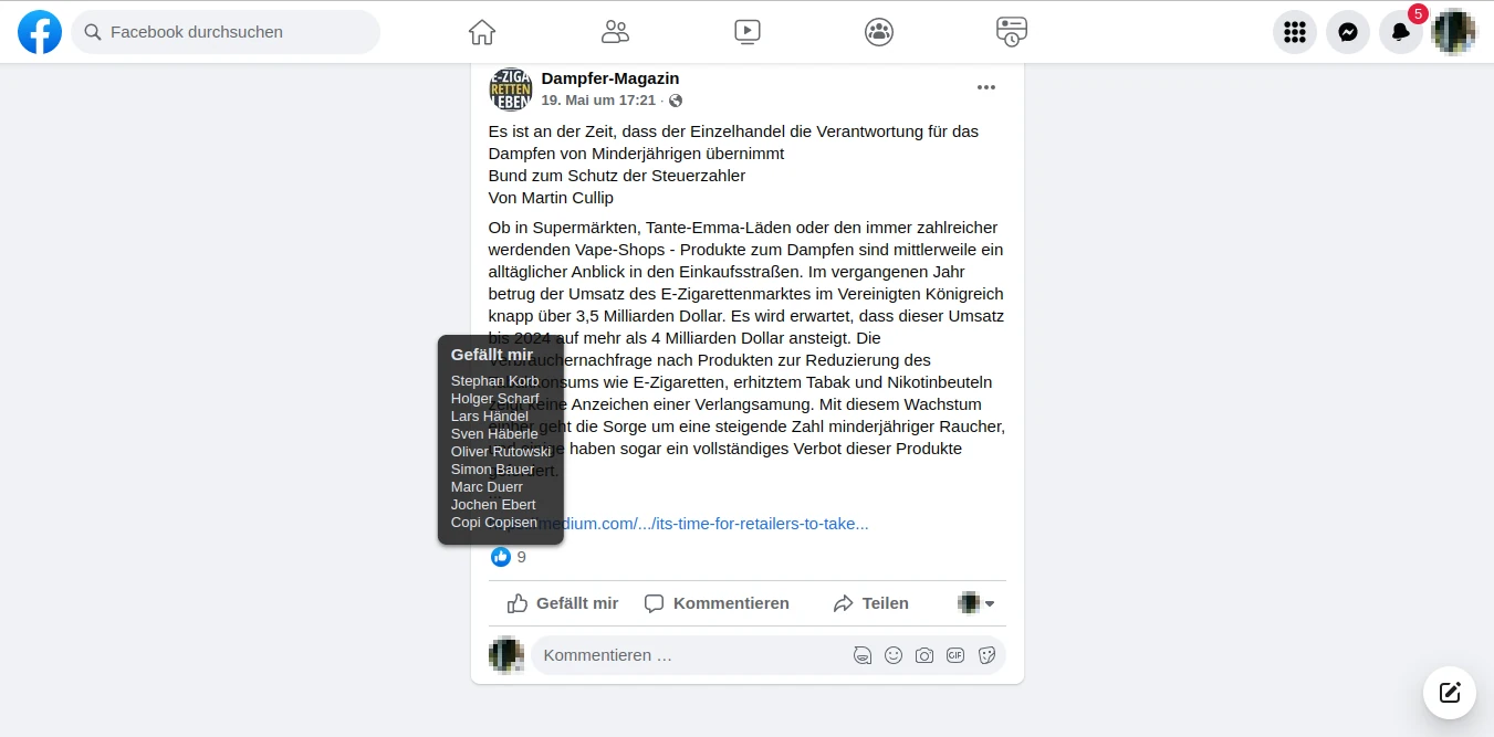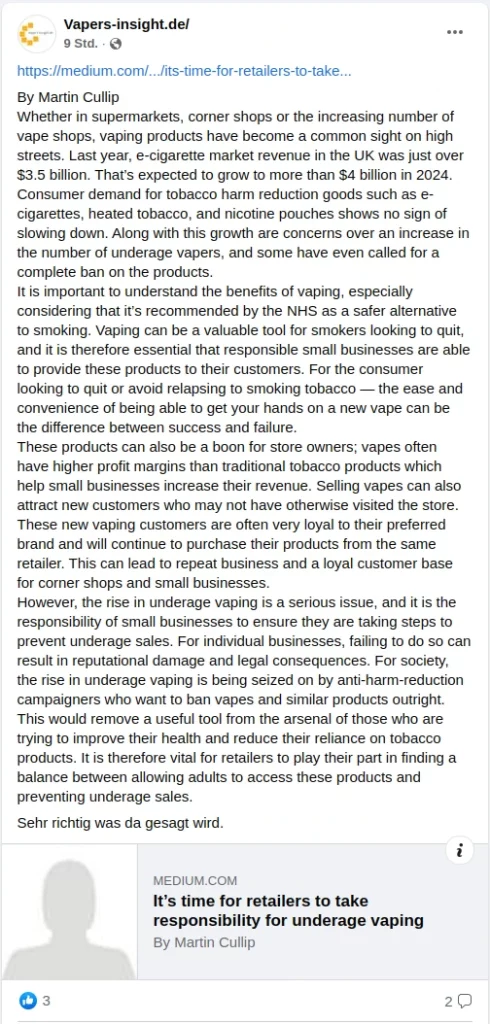 Und am 19. Mai postete dieser „Mitarbeiter der Redaktion“ den Anriss eines Artikels mit dem Titel „Es ist an der Zeit, dass der Einzelhandel die Verantwortung für das Dampfen von Minderjährigen übernimmt“ (im Original „It’s time for retailers to take responsibility for underage vaping“). Erschienen war der Artikel bei „medium“, einer amerikanischen Online-Publishing-Seite.