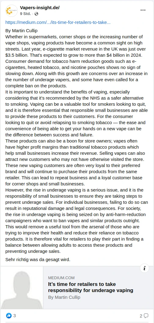 Und noch überraschter (nett gesagt) war ich, als der medium-Artikel auch noch auf der Facebook-Seite von Vapers Insight geteilt wurde… mit der Anmerkung: „Sehr richtig was da gesagt wird.“