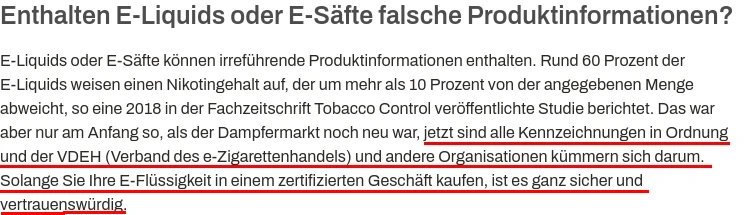Der Knaller ist aber wirklich diese Abschreckung über die gefährlichen Chemikalien. Sie klingen, gepaart mit dem überwiegend auf Einweg E-Zigaretten fokussierten Sortiment, nach einer sich fast schon bewahrheitenden Drohung.