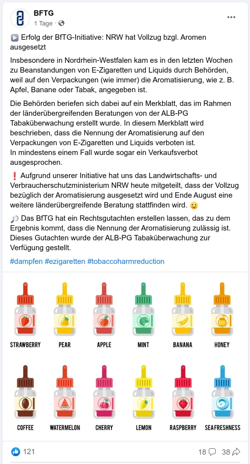 Und das gab der Ordnungsbehörde Informationen, anhand derer diese einschritt. Es soll wohl zu Maßnahmen inklusive der Beschlagnahme von Produkten gekommen sein, weil auf der Außenverpackung stand, wonach das enthaltene Liquid schmeckt.