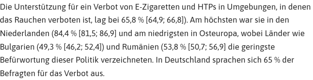 Ja, die ewige Propaganda gegen das Dampfen zeigt Wirkung. Die Bürger der EU sind beinahe fertig dressiert. Und deshalb meinen sie auch, dass auch das Dampfen im Freien eingeschränkt gehört, teilt das Ärzteblatt (rdbl) mit: