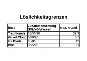 Grundsätzlich ist es so, dass die Löslichkeit von Koffein beschränkt ist. Ohne Tricks lassen sich ca. 23 – 25 mg/ml in einer Traditionale unterbringen, ohne dass die Lösung trübe wird oder Schlieren bildet. Das hört sich viel an, ist aber angesichts der Tatsache, dass man für einen identischen TH ungefähr die doppelte Menge als beim Nikotin benötigt, schon eine Beschränkung. Wer also 12er Nikotin-Liquid dampft, der kommt noch mit einem 24er Koffeinliquid hin und braucht nicht zu „zaubern“. Koffein löst sich allerdings nur in Propylenglykol (PG) und Wasser. In Glycerin (VG) löst es sich hingegen so gut wie gar nicht. Das wiederum ist eine Beschränkung für VG-Dampfer. Wer komplett auf PG verzichten möchte oder muss (er also zu den knapp unter 5 % Menschen weltweit gehört, der tatsächlich unter einer PG-Unverträglichkeit oder -Allergie leidet), der kommt nicht umhin, einen deutlichen Wasseranteil im Liquid zu haben. Weil man aber sicher keine 50-50-VG-Plörre haben möchte, ist man da halt eingeschränkt, was die Menge des Koffeins anbelangt.