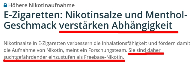 Man hat festgestellt, dass bei Nikotinsalz und Menthol die Probanden viel intensiver gedampft haben und es ihnen subjektiv besser „geschmeckt“ hat (Kurzfassung)….und das könnte! („may increase“) eine Abhängigkeit begünstigen.