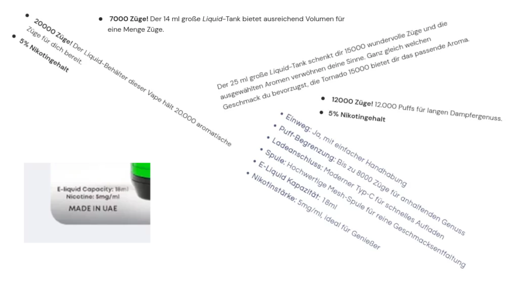 Die Werbe-Links in dem o.g. Artikel verweisen allesamt auf den Online-Shop „Vapes kaufen“ (kein Direktlink, sondern Memento in der Wayback Machine). Laut Impressum ist der Shop in München ansässig. Somit unterliegt er unzweifelhaft den gesetzlichen Vorgaben, die in Deutschland (und der EU) gelten. Verwiesen wird auf „RandM Tornado, Vozol Vapes, Al-Fakher Vapes“.