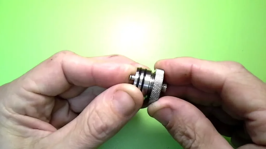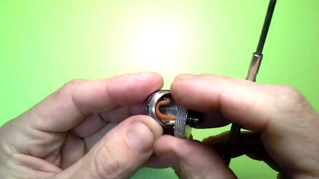 Ist das Kabel erfolgreich angelötet, kann die Base wieder verschraubt werden. Dazu legt man das Kabel schlaufenförmig in die Base (und wenn man mag, verdreht man es leicht entgegen der Drehrichtung für das Zuschrauben). Nun wird das Deck angesetzt und man schraubt es vorsichtig und langsam wieder hinein. Um die Base wieder gegen versehentliches Aufschrauben zu sichern, kommt ein entsprechender Kleber zum Einsatz (Locktite). Es muss aber ein elektrischer Kontakt zwischen Deck und eigentlicher Base vorhanden sein, weshalb man sparsam damit umgehen sollte und man nicht das ganze Gewinde damit einschmieren darf. Es genügt völlig, wenn man das Deck zu einem großen Teil bereits in die Base schraubt und dann in dem noch vorhandenen Spalt etwas von dem Schraubenkleber auf die letzten 1 – 1 1/2 Gewindegänge gibt, bevor man das Deck endgültig bis zum Anschlag einschraubt. Es sollte ordentlich fest, aber nicht bis zum „Kreischen“ festgezogen werden.