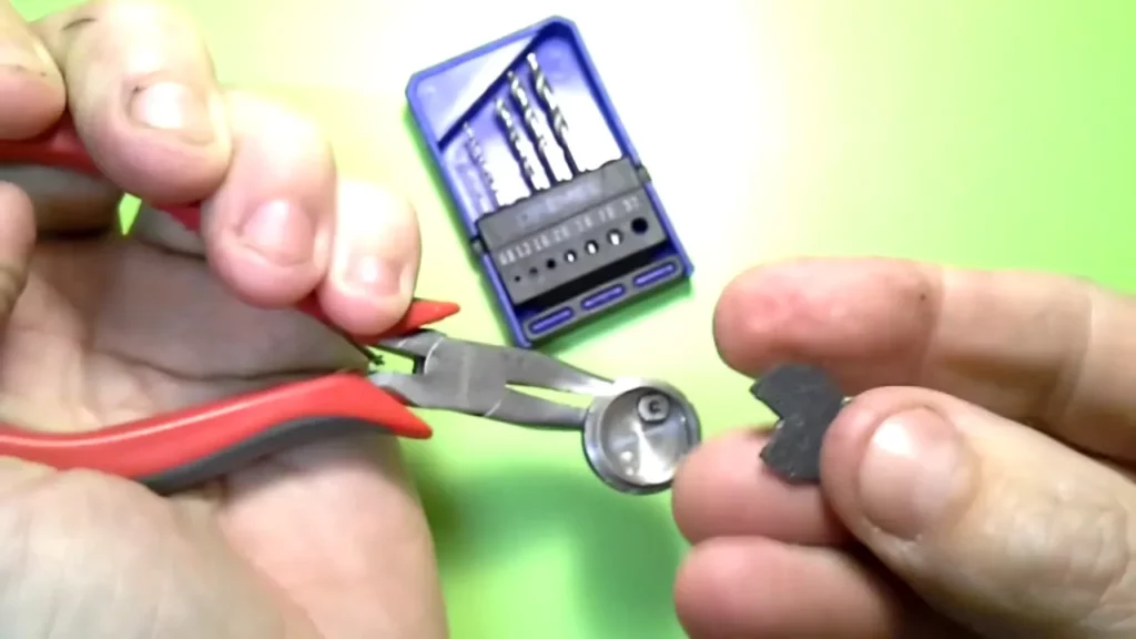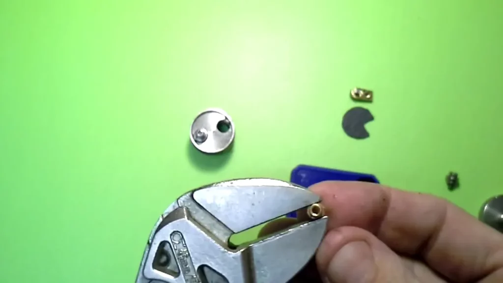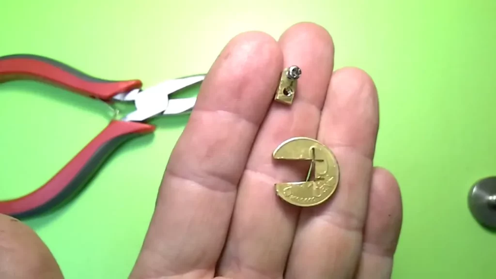 Nun kommt die 10-Cent-Münze ins Spiel. Man schneidet sich mit dem Multitool und einer Trennscheibe ein Stück in den Maßen 6 mm (Breite) und 10 mm (Länge) aus der Münze heraus. Das eine Ende dieser länglichen Brücke wird nun abgerundet (schleifen), damit es nicht an der Seite zu einem Kontakt mit der Hülse des Decks kommt. An dieser Seite wird ein Loch mit 2.5 mm Durchmesser (ohne Gewinde) gebohrt. Dabei sollte man das Loch so ansetzen, dass der Schraubenkopf mit der (abgeschliffenen) Rundung der Brücke ziemlich bündig abschließt.