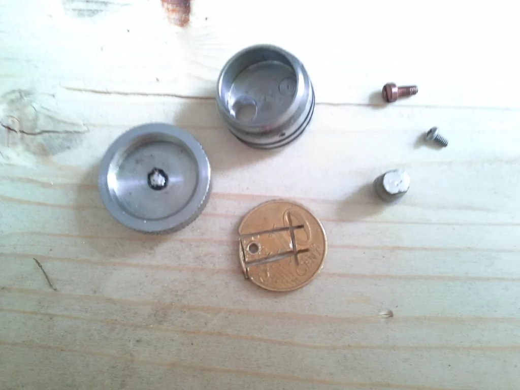 Die Base des FeV (auch der Kopien) ist verschraubt. Das kann man aufgrund der extremen Passgenauigkeit (gerade bei den Originalen) aber kaum sehen und nur erahnen. Das eigentliche Deck mit den Anschlusspolen ist in die Base (mit der Rändelung) eingeschraubt. Die Verschraubung ist überdies mit Spezialkleber gegen versehentliches Lösen gesichert… sie ist also geklebt. Außerdem ist das Gewinde schon recht „knackig“. Und das stellt die eigentliche Hürde bei diesem Workshop dar (aber keine Hürde, über die wir nicht hinweg kämen). Wir müssen diese Verschraubung lösen… und zwar so, dass wir uns die Base nicht verhunzen. Dazu muss man das richtige Gleichgewicht zwischen roher Gewalt und Gefühl finden und ggf. ein wenig tricksen. Außerdem kommt es auf gutes und passendes Werkzeug an.