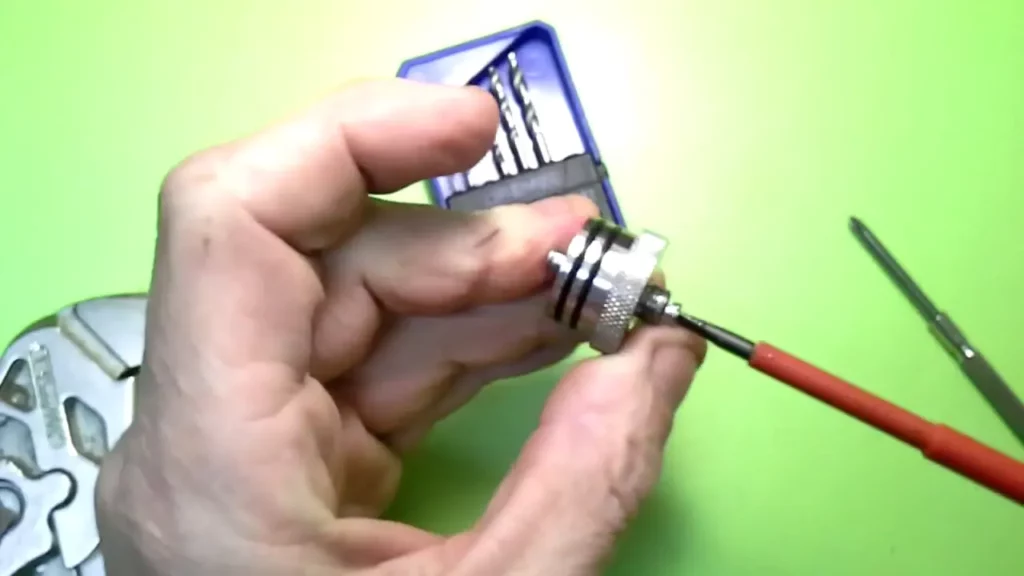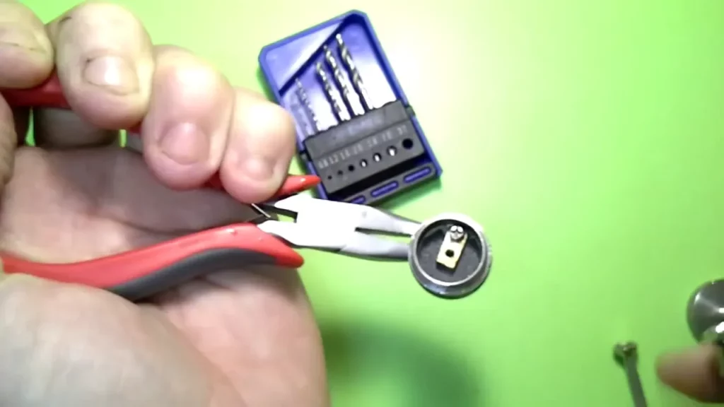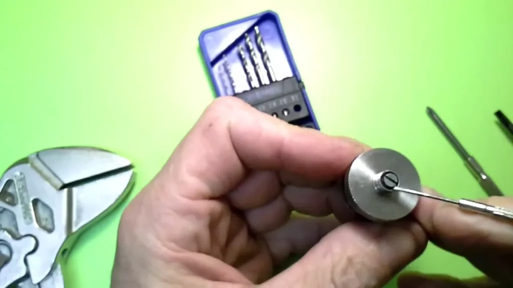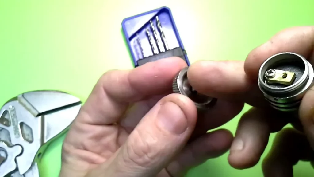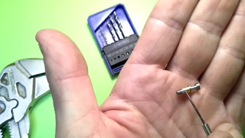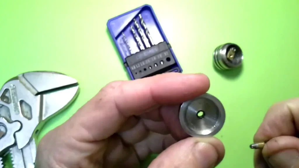 Der Messingpin weist an der Oberseite eine Bohrung mit Innengewinde auf, in die ja der Edelstahlpol hineingeschraubt wird. Die Bohrung ist aber im Originalzustand nicht durchgehend. Das müssen wir ändern. Dazu nimmt man einen möglichst dünnen Metallbohrer (Ron hat einen 0.8er verwendet) und durchbohrt zentral den Pin (selbstverständlich von der bereits vorhandenen Bohrung mit Gewinde aus). Die schon vorhandene Bohrung hat ein 2.5 mm Gewinde. Nun erweitert man die Bohrung genau in der Mitte mit einem 2 mm Metallbohrer. Nun nimmt man den 2.5 mm Gewindeschneider und dreht ihn in das vorhandene Gewinde und schneidet mit Gefühl das Gewinde weiter durch die gesamte Bohrung.