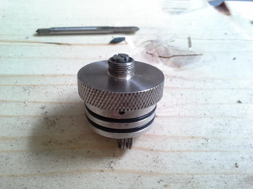 Deck und Base werden wieder auseinandergeschraubt, die Messingbrücke wieder losgeschraubt und entnommen. Jetzt wird die eben „markierte“ Bohrung mit einem 2 mm Metallbohrer durchgebohrt und mit dem 2.5 mm Gewindeschneider ein Innengewinde hineingeschnitten.