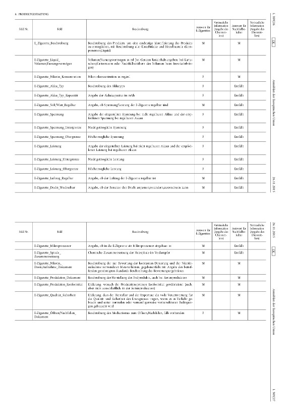 Mitteilungspflichten (1) Hersteller und Importeure von elektronischen Zigaretten und Nachfüllbehältern sind verpflichtet, der zuständigen Behörde in einer nach Markennamen und Art der Erzeugnisse gegliederten Liste Folgendes mitzuteilen: 1. den Namen, die Anschrift und die elektronischen Kontaktdaten des Herstellers, Importeurs oder einer vom Hersteller oder Importeur zu bestimmenden, in der Europäischen Union ansässigen verantwortlichen juristischen oder natürlichen Person, 2. alle in der elektronischen Zigarette oder im Nachfüllbehälter enthaltenen Inhaltsstoffe und ausgebrachten Emissionen einschließlich a) ihrer Mengen in absteigender Reihenfolge ihres Gewichtsanteils, 3. Informationen über die Nikotindosis und -aufnahme bei Konsum unter normalen oder vernünftigerweise vorhersehbaren Bedingungen, 4. eine Beschreibung der Bestandteile der elektronischen Zigarette oder des Nachfüllbehälters, einschließlich vorhandener Öffnungs- und Nachfüllmechanismen, 5. eine Beschreibung des Herstellungsverfahrens einschließlich der Angabe, ob es sich um eine Serienherstellung handelt, 6. die weiteren in Artikel 2 Nummer 1 in Verbindung mit dem Anhang des Durchführungsbeschlusses (EU) 2015/2183 der Kommission vom 24. November 2015 (ABl. L 309 vom 26.11.2015, S. 15) vorgesehenen Angaben zu den Produkteigenschaften, zur Produktbeschreibung, zur Verpackung, zur Spezifikation sowie zu Ort und Zeit der Markteinführung und -rücknahme. |