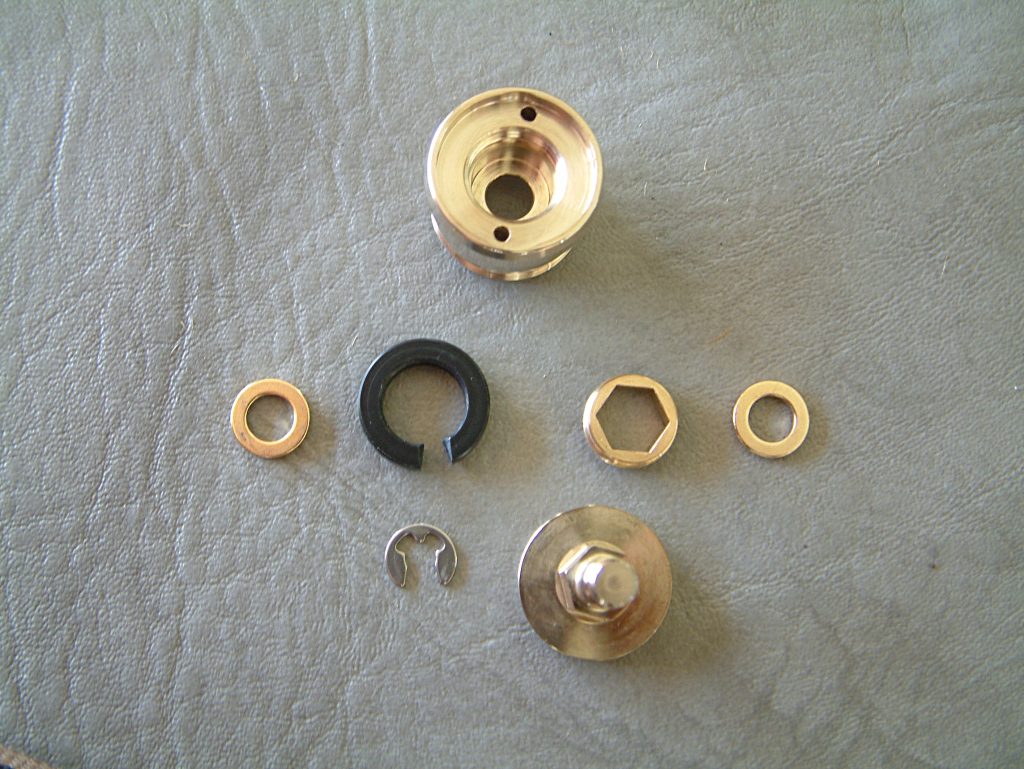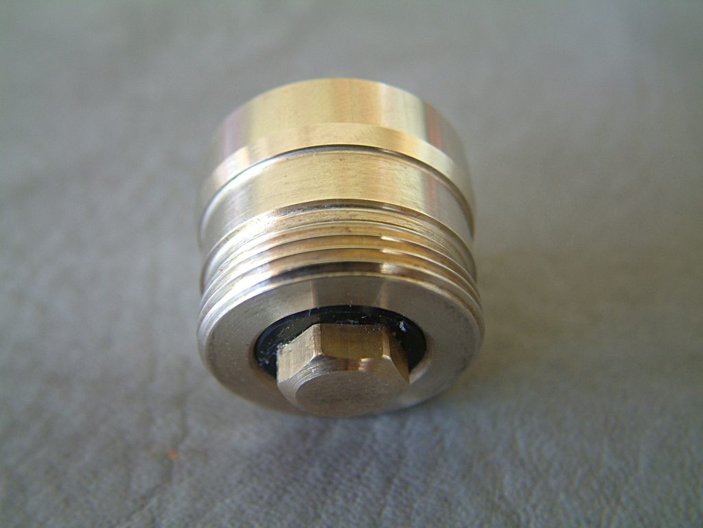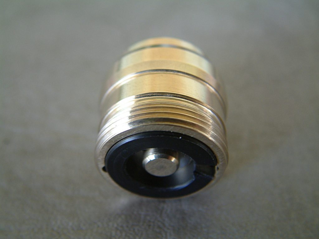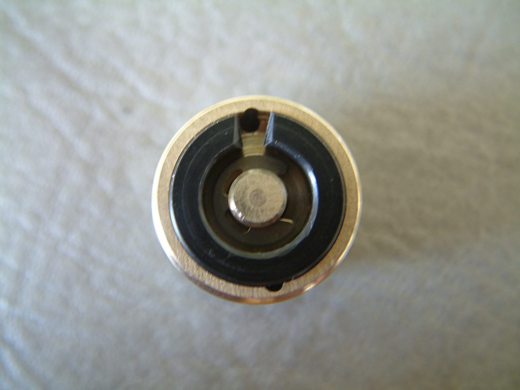 Ich habe schon sehr viele verschiedene mechanische Akkuträger mit den verschiedensten Tastern in den Händen gehabt, aber noch nie einen, der einen so hervorragenden Taster hat, wie der Mk1. Dass auch das Gewinde der Tastereinheit von extrem hoher Qualität ist, habe ich ja bereits erwähnt. Der Taster selbst vermittelt ein nie dagewesenes Druck-Gefühl. Er lässt sich absolut geräuschfrei betätigen und kratzt, schabt oder verkantet nicht. Man hat das Gefühl, er würde sich drücken lassen, ohne dass er den unbeweglichen Teil der Schalter-Einheit berührt. Er kommt ohne Feder aus, sondern funktioniert durch sich gegenseitig abstoßende Ringmagneten im Inneren. Die Tastereinheit ist ebenfalls in Ecobrass ausgeführt. Auf der Seite, die im Akkurohr liegt, ist ein Delrin-Isolatorring angebracht, der sicher stellt, dass auch Akkus ohne Isolierung am Boden nicht zu Dauerfeuer führen. In den Isolatorring ist eine Kerbe eingearbeitet, durch die ein eventueller Überdruck durch einen ausgasenden Akku an die verdeckt und unsichtbar angebrachten Entgasungslöcher entweichen kann und um den in der Schalter-Einheit eingeklemmten Ring leichter entfernen zu können. Der Isolatorring ist an beiden Seiten angefast, an der Innenseite des Schalters stärker, damit die Entgasungslöcher nicht verdeckt werden. Hat man den Isolatorring entfernt, so sieht man die am äußeren Rand gebohrten Entgasungslöcher. Der Pin des Schalter-Pols wird durch einen Sprengring (Wellensicherungsring) gehalten (im Lieferumfang befindet sich ein Ersatz-Ring). Entfernt man diesen (durch Hebeln mit einem Schraubendreher), so kann der Taster nach Unten entnommen werden. Der Taster selbst ist einteilig, besteht aus der eigentlichen Drückerplatte und einer „Achse“, die im unteren Bereich als Sechskant ausgeführt ist und am oberen Ende zum Runden Tasterpol wird. Der als Sechskant ausgeführte Teil dient zwei Zwecken. Einerseits der Führung des beweglichen Schalters und andererseits als „Inbusschlüssel“, mit dem ein in die Bottomcap eingedrehtes Element mit Innensechskant und Außengewinde hinein- und hinausgeschraubt werden kann. Im montierten Zustand lässt sich dieses Teil nicht ganz zwei Gewindegänge herausschrauben. Ist es ausgeschraubt, blockiert es den Taster und dient somit der Locking-Funktion. Das Führungs- und Locking-Element gleitet dabei im Inneren des Schalters in Richtung der Tasterplatte. Das führt dazu, dass sich der Taster auch im gesperrten Zustand nicht herausschraubt… es entsteht kein Spalt, wie bei manch anderen System. Dass auch dieses Gewinde in höchster Qualität ausgeführt ist, brauche ich wohl nicht mehr anzumerken. Gleiches gilt für den Innensechskant und den Sechskantbereich des Tasters. Alles ist derart genau gearbeitet und sauber bearbeitet, dass der Schalter butterweich und ohne zu haken oder zu verkanten bewegt werden kann. Entfernt man im demontierten Zustand den Locking-Part (unter Zuhilfenahme der Taster-Achse), kommen darunter zwei vergoldete Ringmagneten zum Vorschein, die die Feder ersetzen.