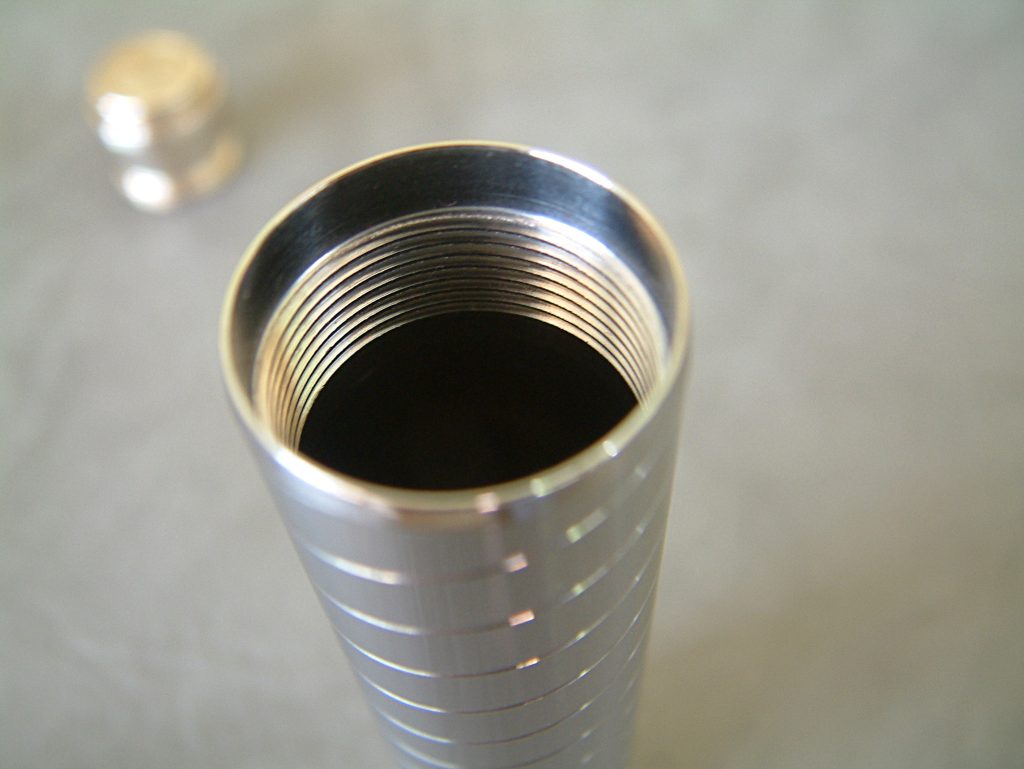 Wenn man nun die Standard-Topcap betrachtet, stellt man fest, das diese erst in der unteren Hälfte des schmaleren Bereichs ein Gewinde aufweist. Gleichzeitig ist das Gewinde in der Tube ebenfalls ein Stück von der Oberkante entfernt nach innen versetzt geschnitten. Dadurch wird das schlankere untere Ende der Topcap im Inneren der Tube versenkt, wenn man sie aufschraubt. Das gilt im übrigen auch für die Tastereinheit. Beide Elemente sind, ebenso wie der Rand der Tube angefast, so dass sich optisch eine kleine Einkerbung ergibt, die jedoch als Design-Element wirkt. Durch diese versenkte Montage ist es nun möglich, den Akkuträger auf verschiedene Akkulängen anzupassen, ohne dass Gewindegänge sichtbar werden und das bei weiterhin gefälliger Optik. Diese Methode der Einstellung auf die Akkulänge ist optimal. Wenn ich an die Tobsuchtsanfälle denke, die ich bei anderen AT teilweise bekomme. Ein Beispiel ist der Panzer Mod. Ohne eine nachträglich eingebaute recht stramme Feder unter der Pluspol-Schraube kann der einen schon in den Wahnsinn treiben. Ständig schraubt man diese beim Zuschrauben durch den sich mitdrehenden Akku wieder rein, es rappelt und der Kontakt ist nicht wirklich gut.