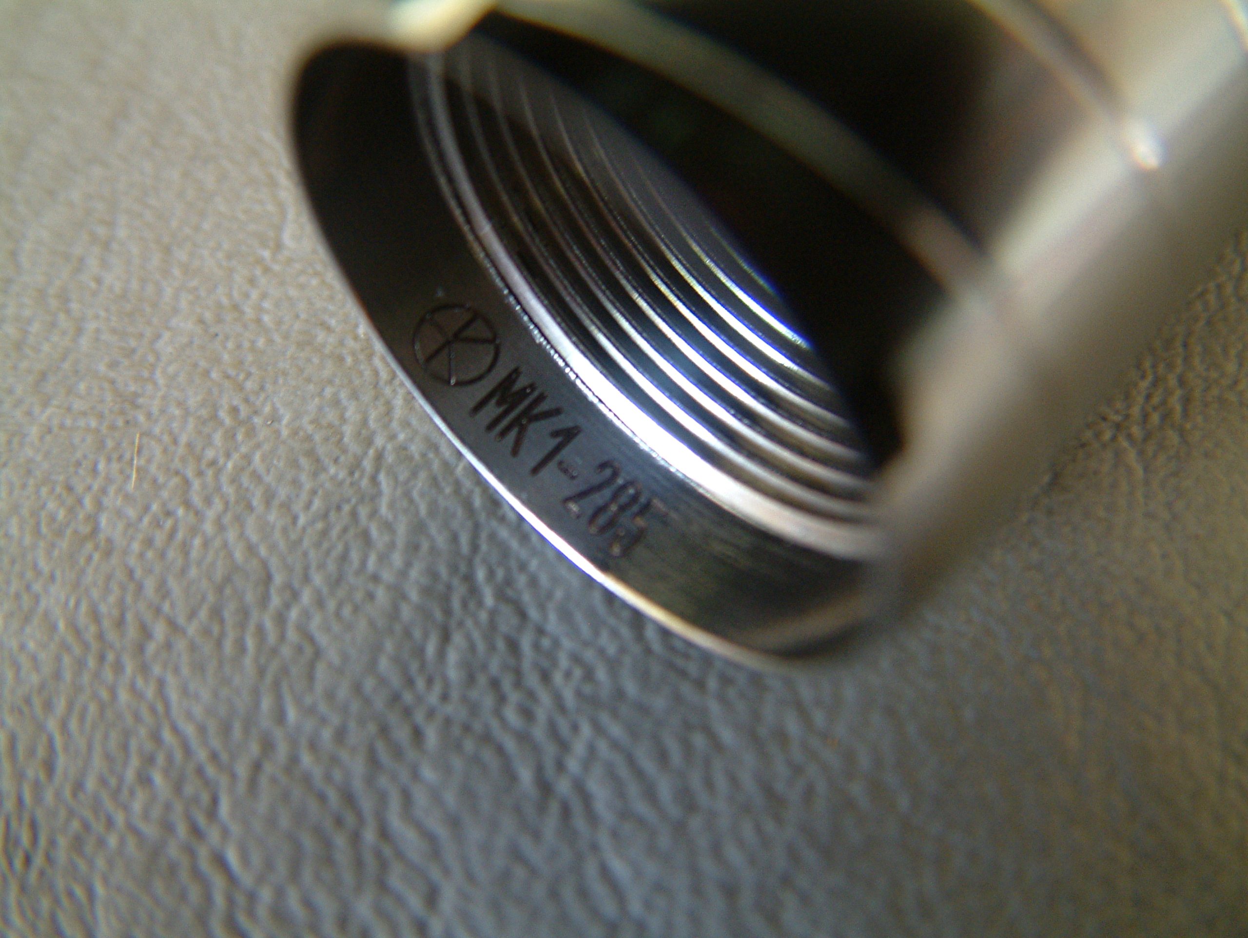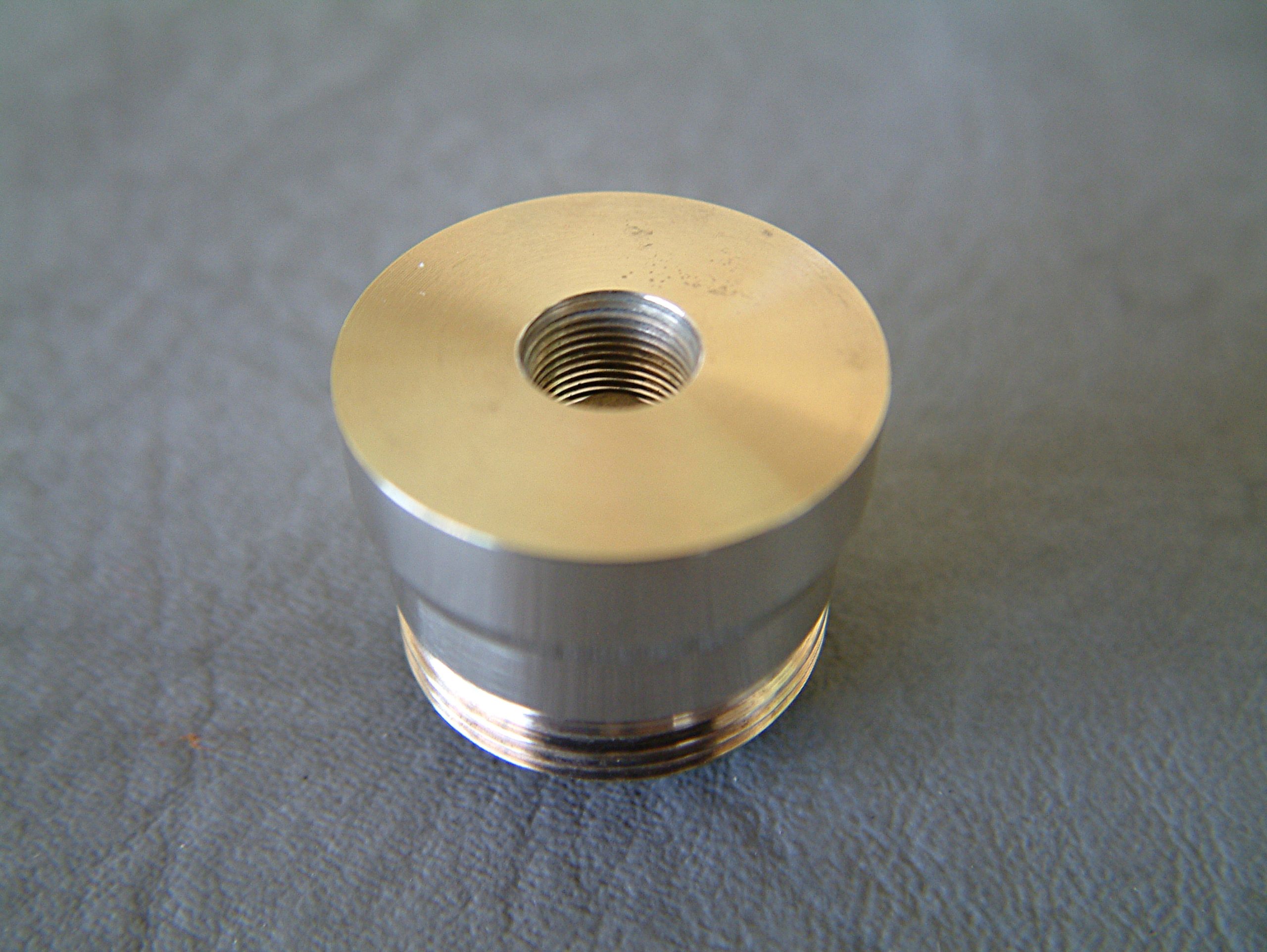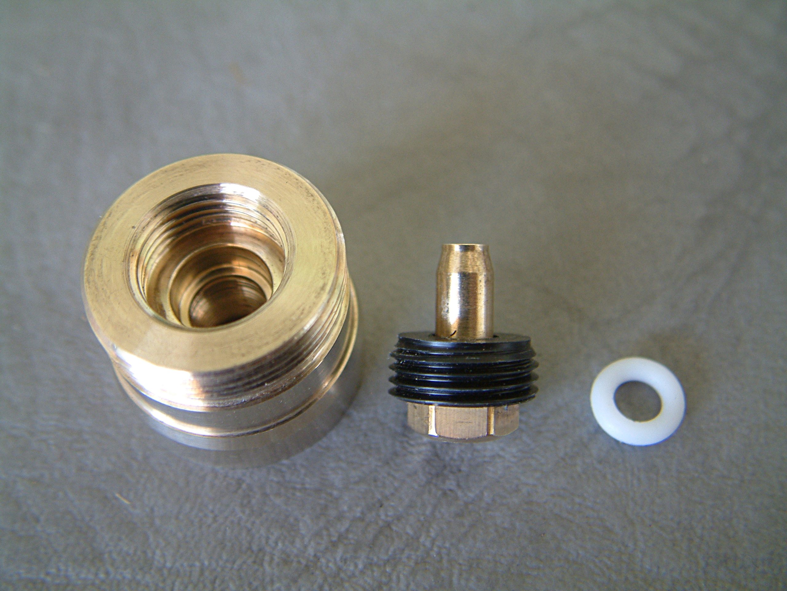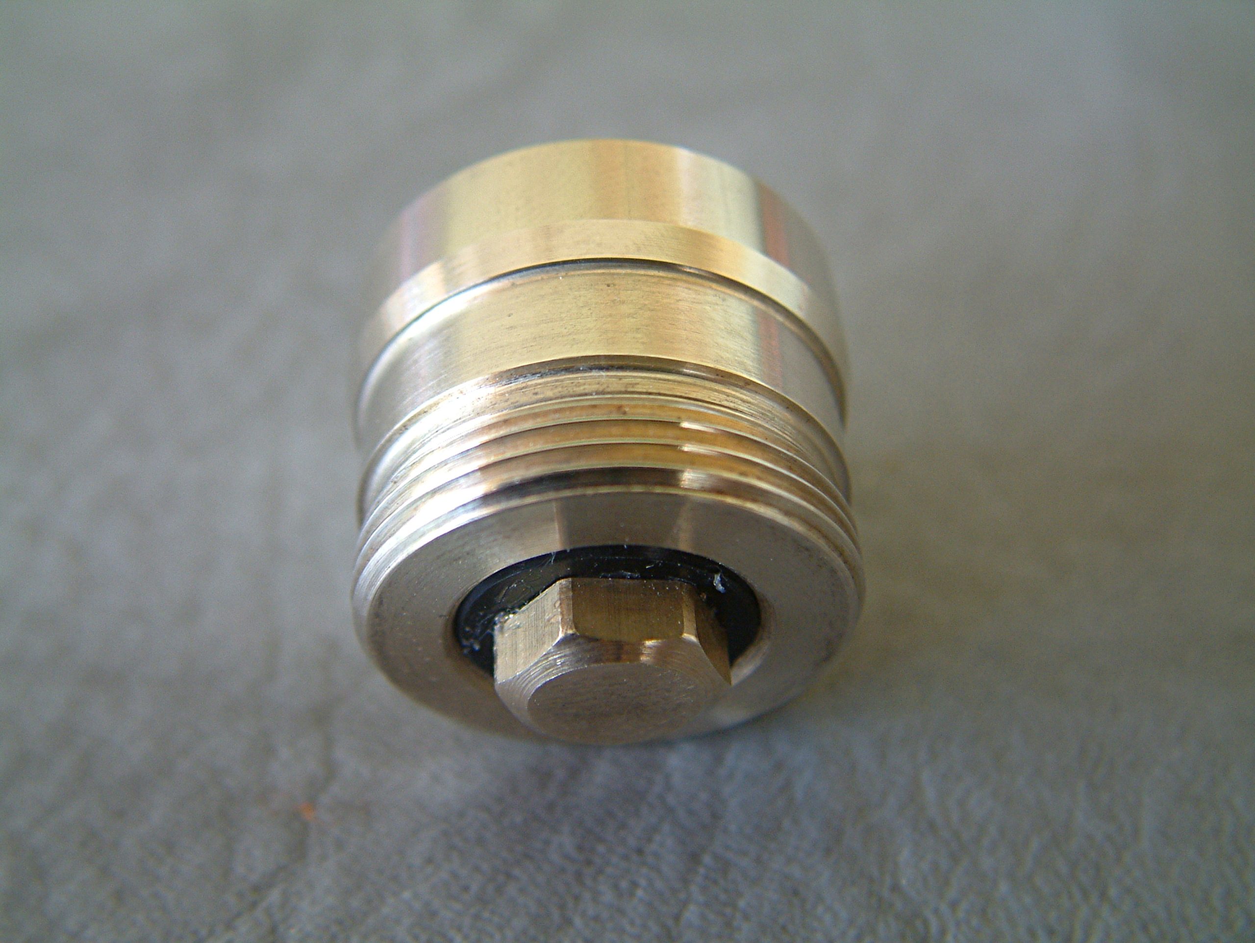 Ich habe schon sehr viele verschiedene mechanische Akkuträger mit den verschiedensten Tastern in den Händen gehabt, aber noch nie einen, der einen so hervorragenden Taster hat, wie der Mk1. Dass auch das Gewinde der Tastereinheit von extrem hoher Qualität ist, habe ich ja bereits erwähnt. Der Taster selbst vermittelt ein nie dagewesenes Druck-Gefühl. Er lässt sich absolut geräuschfrei betätigen und kratzt, schabt oder verkantet nicht. Man hat das Gefühl, er würde sich drücken lassen, ohne dass er den unbeweglichen Teil der Schalter-Einheit berührt. Er kommt ohne Feder aus, sondern funktioniert durch sich gegenseitig abstoßende Ringmagneten im Inneren. Die Tastereinheit ist ebenfalls in Ecobrass ausgeführt. Auf der Seite, die im Akkurohr liegt, ist ein Delrin-Isolatorring angebracht, der sicher stellt, dass auch Akkus ohne Isolierung am Boden nicht zu Dauerfeuer führen. In den Isolatorring ist eine Kerbe eingearbeitet, durch die ein eventueller Überdruck durch einen ausgasenden Akku an die verdeckt und unsichtbar angebrachten Entgasungslöcher entweichen kann und um den in der Schalter-Einheit eingeklemmten Ring leichter entfernen zu können. Der Isolatorring ist an beiden Seiten angefast, an der Innenseite des Schalters stärker, damit die Entgasungslöcher nicht verdeckt werden. Hat man den Isolatorring entfernt, so sieht man die am äußeren Rand gebohrten Entgasungslöcher. Der Pin des Schalter-Pols wird durch einen Sprengring (Wellensicherungsring) gehalten (im Lieferumfang befindet sich ein Ersatz-Ring). Entfernt man diesen (durch Hebeln mit einem Schraubendreher), so kann der Taster nach Unten entnommen werden. Der Taster selbst ist einteilig, besteht aus der eigentlichen Drückerplatte und einer „Achse“, die im unteren Bereich als Sechskant ausgeführt ist und am oberen Ende zum Runden Tasterpol wird. Der als Sechskant ausgeführte Teil dient zwei Zwecken. Einerseits der Führung des beweglichen Schalters und andererseits als „Inbusschlüssel“, mit dem ein in die Bottomcap eingedrehtes Element mit Innensechskant und Außengewinde hinein- und hinausgeschraubt werden kann. Im montierten Zustand lässt sich dieses Teil nicht ganz zwei Gewindegänge herausschrauben. Ist es ausgeschraubt, blockiert es den Taster und dient somit der Locking-Funktion. Das Führungs- und Locking-Element gleitet dabei im Inneren des Schalters in Richtung der Tasterplatte. Das führt dazu, dass sich der Taster auch im gesperrten Zustand nicht herausschraubt… es entsteht kein Spalt, wie bei manch anderen System. Dass auch dieses Gewinde in höchster Qualität ausgeführt ist, brauche ich wohl nicht mehr anzumerken. Gleiches gilt für den Innensechskant und den Sechskantbereich des Tasters. Alles ist derart genau gearbeitet und sauber bearbeitet, dass der Schalter butterweich und ohne zu haken oder zu verkanten bewegt werden kann. Entfernt man im demontierten Zustand den Locking-Part (unter Zuhilfenahme der Taster-Achse), kommen darunter zwei vergoldete Ringmagneten zum Vorschein, die die Feder ersetzen.