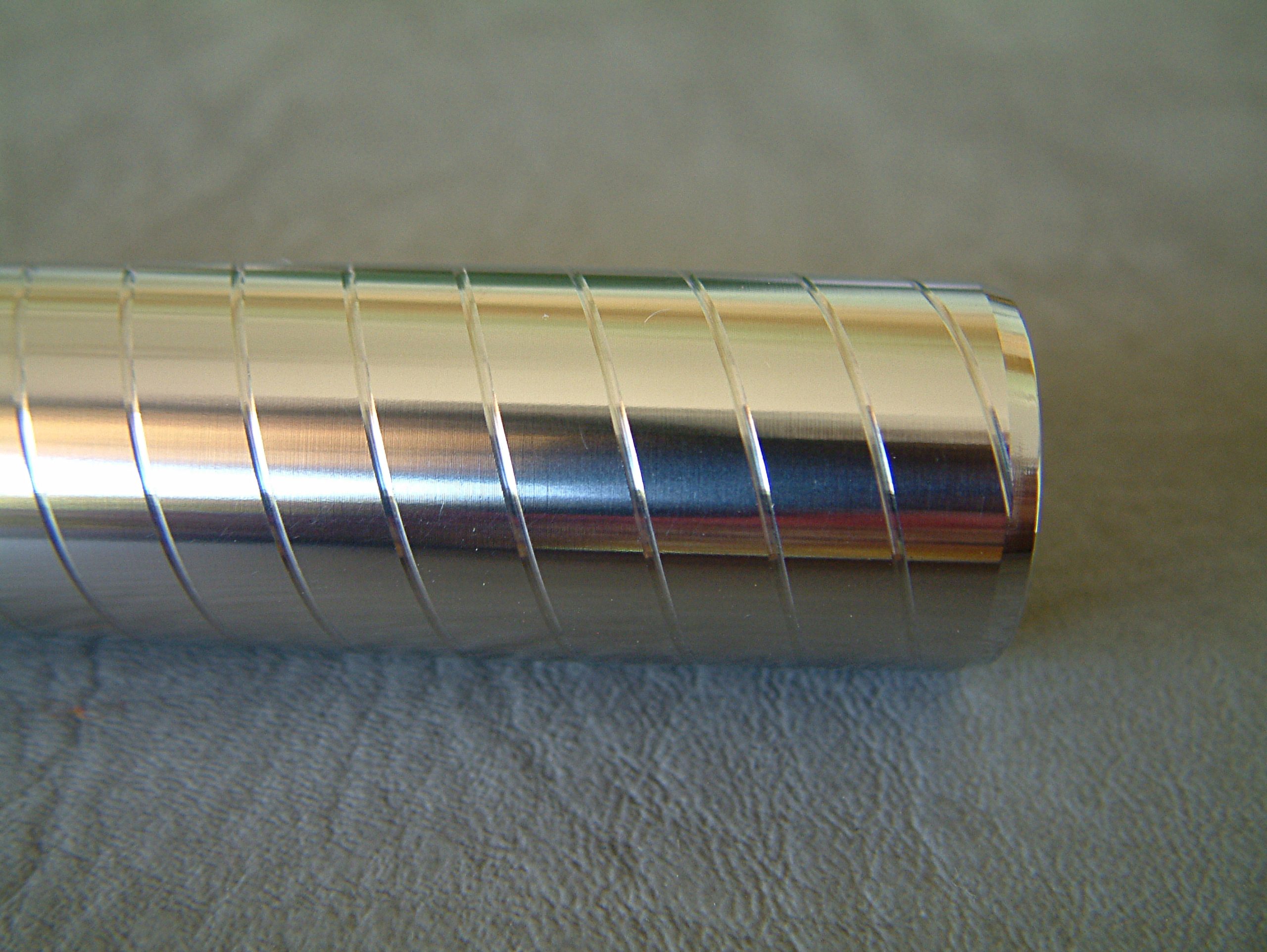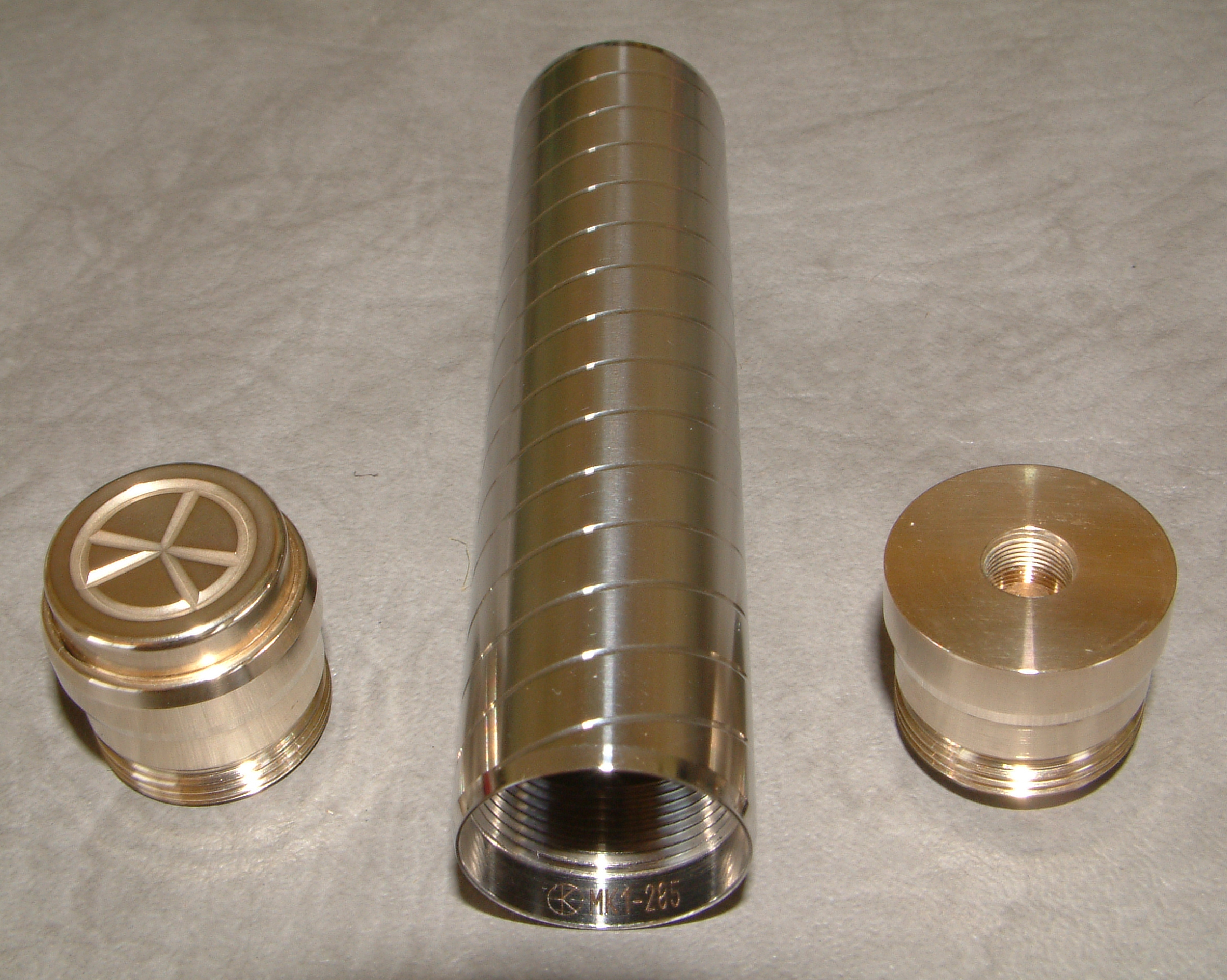 Die Akkuhülse (Tube) besteht aus Edelstahl V4A 316L (besonders säureresistenter austenitischer rostfreier Stahl, der häufig in der pharmazeutischen Industrie und in Medizin- und Zahntechnik eingesetzt wird). Sie ist in höchster Präzision gefertigt und perfekt bearbeitet. Im Inneren der Tube ist die Seriennummer eingraviert. Es finden sich absolut keine scharfen Kanten oder Grate. Sie ist in unterschiedlichen Ausführungen erhältlich. Polituren werden bei Kopp Design von Hand ausgeführt. Der Mk1 ist in den Oberflächen „markant“ mit einer deutlichen etwas tieferen Drehrille, „geschliffen“ mit einer dezent matten, seidig glänzenden Oberfläche und „geschlichtet“ mit feingedrehter seidenmatter Oberfläche erhältlich. Die Oberfläche kann ohne Designelemente, mit einem eingeschnittenen 3G Gewinde (dreigängig), zwei gegenläufig eingeschnittene 3G Gewinde („cross“) und als „Bavaria“ mit Drehrillen, die die Rauten der bayrischen Flagge nachbilden, erworben werden. Schließlich sind immer wieder verschiedene „Special Editions“ zu bekommen, bei denen die Oberfläche durch Tempern gefärbt wurde. Sehr schön sind „Darkblue“ (der Name sagt alles) und „Blue Pearl“ (eine seidige, perlmuttartige blaue Oberfläche), die (derzeit) in der Ausführung „Bavaria“ erhältlich sind.